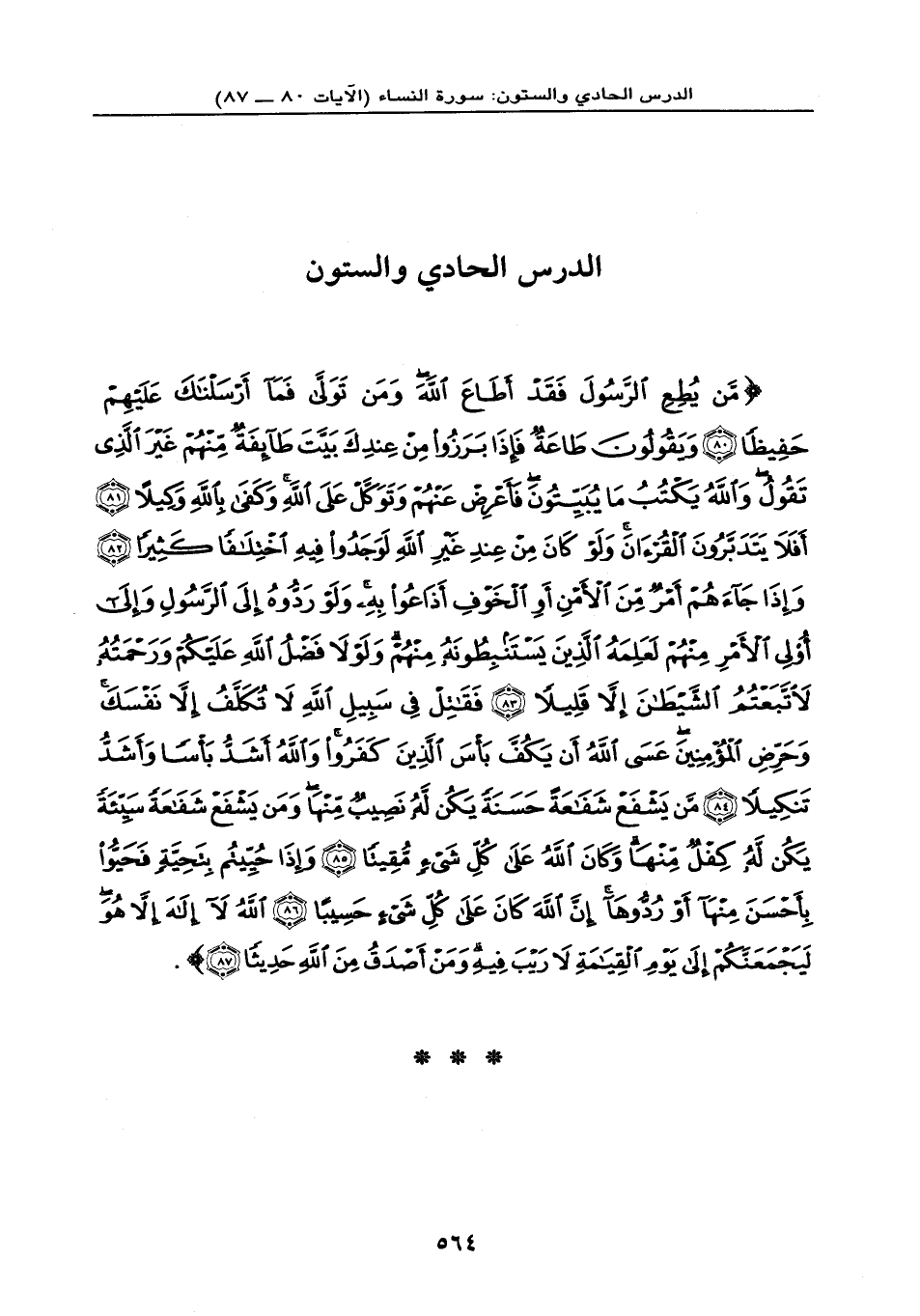 {مَّنْ يُطِعِ الرَّسُولَ فَقَدْ أَطَاعَ اللهَ وَمَن تَوَلَّى فَمَا أَرْسَلْنَاكَ عَلَيْهِمْ حَفِيظاً (80) وَيَقُولُونَ طَاعَةٌ فَإِذَا بَرَزُواْ مِنْ عِندِكَ بَيَّتَ طَآئِفَةٌ مِّنْهُمْ غَيْرَ الَّذِي تَقُولُ وَاللهُ يَكْتُبُ مَا يُبَيِّتُونَ فَأَعْرِضْ عَنْهُمْ وَتَوَكَّلْ عَلَى اللهِ وَكَفَى بِاللهِ وَكِيلاً (81) أَفَلاَ يَتَدَبَّرُونَ الْقُرْآنَ وَلَوْ كَانَ مِنْ عِندِ غَيْرِ اللهِ لَوَجَدُواْ فِيهِ اخْتِلاَفاً كَثِيراً (82) وَإِذَا جَاءهُمْ أَمْرٌ مِّنَ الأَمْنِ أَوِ الْخَوْفِ أَذَاعُواْ بِهِ وَلَوْ رَدُّوهُ إِلَى الرَّسُولِ وَإِلَى أُوْلِي الأَمْرِ مِنْهُمْ لَعَلِمَهُ الَّذِينَ يَسْتَنبِطُونَهُ مِنْهُمْ وَلَوْلاَ فَضْلُ اللهِ عَلَيْكُمْ وَرَحْمَتُهُ لاَتَّبَعْتُمُ الشَّيْطَانَ إِلا قَلِيلاً (83) فَقَاتِلْ فِي سَبِيلِ اللهِ لاَ تُكَلَّفُ إِلا نَفْسَكَ وَحَرِّضِ الْمُؤْمِنِينَ عَسَى اللهُ أَن يَكُفَّ بَأْسَ الَّذِينَ كَفَرُواْ وَاللهُ أَشَدُّ بَأْساً وَأَشَدُّ تَنكِيلاً (84) مَّن يَشْفَعْ شَفَاعَةً حَسَنَةً يَكُن لَّهُ نَصِيبٌ مِّنْهَا وَمَن يَشْفَعْ شَفَاعَةً سَيِّئَةً يَكُن لَّهُ كِفْلٌ مِّنْهَا وَكَانَ اللهُ عَلَى كُلِّ شَيْءٍ مُّقِيتاً (85) وَإِذَا حُيِّيْتُم بِتَحِيَّةٍ فَحَيُّواْ بِأَحْسَنَ مِنْهَا أَوْ رُدُّوهَا إِنَّ اللهَ كَانَ عَلَى كُلِّ شَيْءٍ حَسِيباً (86) اللهُ لا إِلَهَ إِلا هُوَ لَيَجْمَعَنَّكُمْ إِلَى يَوْمِ الْقِيَامَةِ لاَ رَيْبَ فِيهِ وَمَنْ أَصْدَقُ مِنَ اللهِ حَدِيثاً (87) } .