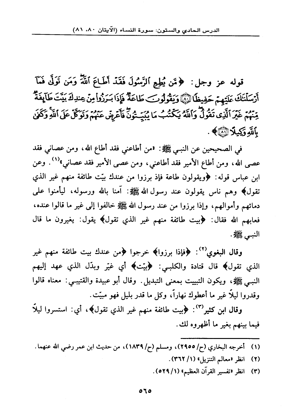 في الصحيحين عن النبي - صلى الله عليه وسلم -: «من أطاعني فقد أطاع الله، ومن عصاني فقد عصى الله، ومن أطاع الأمير فقد أطاعني، ومن عصى الأمير فقد عصاني» . وعن ابن عباس قوله: {وَيَقُولُونَ طَاعَةٌ فَإِذَا بَرَزُواْ مِنْ عِندِكَ بَيَّتَ طَآئِفَةٌ مِّنْهُمْ غَيْرَ الَّذِي تَقُولُ} ، وهم ناس يقولون عند رسول الله - صلى الله عليه وسلم -: آمنا بالله ورسوله، ليأمنوا على دمائهم وأموالهم، وإذا برزوا من عند رسول الله - صلى الله عليه وسلم - خالفوا إلى غير ما قالوا عنده فعابهم الله فقال: {بَيَّتَ طَآئِفَةٌ مِّنْهُمْ غَيْرَ الَّذِي تَقُولُ} ، يقول: يغيرون ما قال النبي - صلى الله عليه وسلم -.