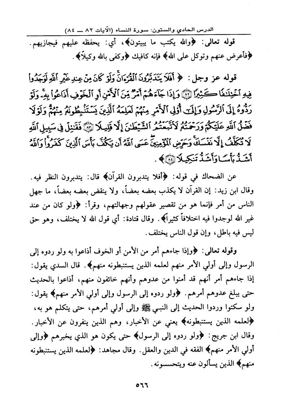 قوله عز وجل: {أَفَلاَ يَتَدَبَّرُونَ الْقُرْآنَ وَلَوْ كَانَ مِنْ عِندِ غَيْرِ اللهِ لَوَجَدُواْ فِيهِ اخْتِلاَفاً كَثِيراً (82) وَإِذَا جَاءهُمْ أَمْرٌ مِّنَ الأَمْنِ أَوِ الْخَوْفِ أَذَاعُواْ بِهِ وَلَوْ رَدُّوهُ إِلَى الرَّسُولِ وَإِلَى أُوْلِي الأَمْرِ مِنْهُمْ لَعَلِمَهُ الَّذِينَ يَسْتَنبِطُونَهُ مِنْهُمْ وَلَوْلاَ فَضْلُ اللهِ عَلَيْكُمْ وَرَحْمَتُهُ لاَتَّبَعْتُمُ الشَّيْطَانَ إِلا قَلِيلاً (83) فَقَاتِلْ فِي سَبِيلِ اللهِ لاَ تُكَلَّفُ إِلا نَفْسَكَ وَحَرِّضِ الْمُؤْمِنِينَ عَسَى اللهُ أَن يَكُفَّ بَأْسَ الَّذِينَ كَفَرُواْ وَاللهُ أَشَدُّ بَأْساً وَأَشَدُّ تَنكِيلاً (84) } .
