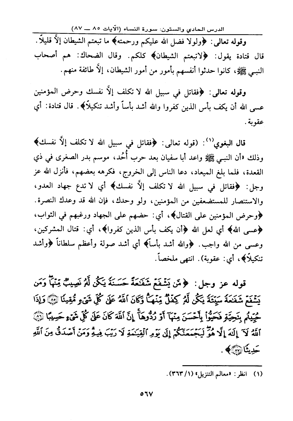 قال البغوي: (قوله تعالى: {فَقَاتِلْ فِي سَبِيلِ اللهِ لاَ تُكَلَّفُ إِلا نَفْسَكَ} وذلك أن النبي - صلى الله عليه وسلم - واعد أبا سفيان بعد حرب أُحُد، موسم بدر الصغرى في ذي القعدة، فلما بلغ الميعاد، دعا الناس إلى الخروج، فكرهه بعضهم، فأنزل الله عز وجل: {فَقَاتِلْ فِي سَبِيلِ اللهِ لاَ تُكَلَّفُ إِلا نَفْسَكَ} ، أي: لا تدع جهاد العدو، والاستنصار للمستضعفين من المؤمنين، ولو وحدك، فإن الله قد وعدك النصرة، {وَحَرِّضِ الْمُؤْمِنِينَ} على القتال أي: حضهم على الجهاد ورغبهم في الثواب، {عَسَى اللهُ} ، أي: لعل الله {أَن يَكُفَّ بَأْسَ الَّذِينَ كَفَرُواْ} ، أي: قتال