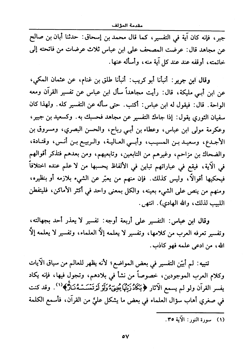 وقال ابن جرير: أنبأنا أبو كريب: أنبأنا طلق بن غنام، عن عثمان المكي، عن ابن مليكة، قال: رأيت مجاهدًا سأل ابن عباس عن تفسير القرآن ومعه الواحة. قال: فيقول له ابن عباس: أكتب. حتى سأله عن التفسير كله. ولهذا كان سفيان الثوري يقول: إذا جاءك التفسير عن مجاهد فحسبك به. وكسعيد بن جبير، وعكرمة مولى ابن عباس، وعطاء بن أبي رباح، والحسن البصري، ومسروق بن الأجدع، وسعيد ابن المسيب، وأبي العالية، والربيع بن أنس، وقتادة، والضحاك بن مزاحم، وغيرهم من التابعين، وتابعيهم، ومن بعدهم فتذكر أقوالهم في الآية، فيقع في عباراتهم تباين في الألفاظ يحسبها من لا علم عنده اختلافًا فيحكيها أقوالاً، وليس كذلك. فإن منهم من يعبّر عن الشيء بلازمه أو بنظيره، ومنهم من ينص على الشيء بعينه، والكل بمعنى واحد في أكثر الأماكن، فليتفطن اللبيب لذلك، والله الهادي) . انتهى.