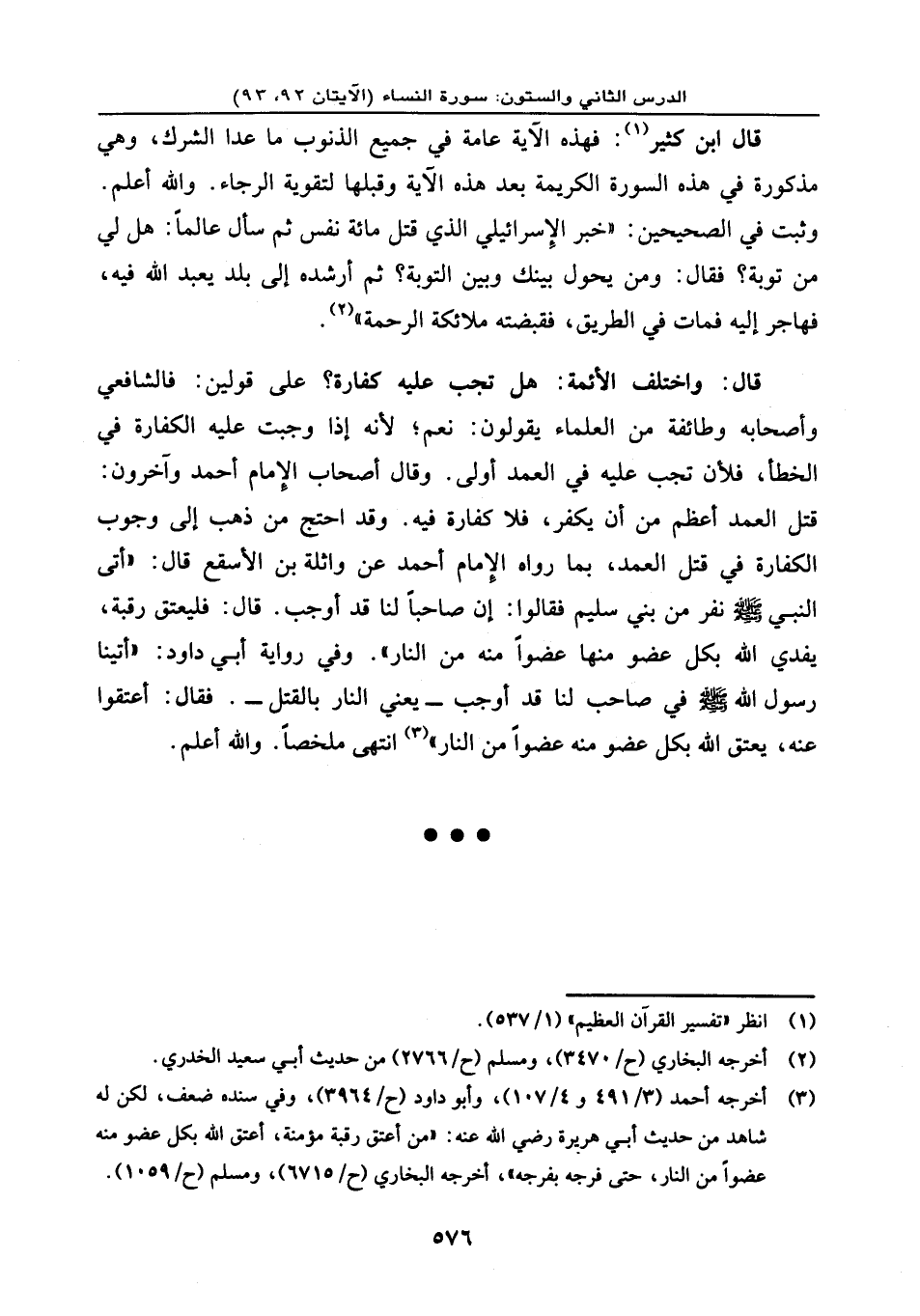 قال: واختلف الأئمة: هل تجب عليه كفارة؟ على قولين: فالشافعي وأصحابه وطائفة من العلماء يقولون: نعم؛ لأنه إذا وجبت عليه الكفارة في الخطأ، فلأن تجب عليه في العمد أولى. وقال أصحاب الإمام أحمد وآخرون: قتل العمد أعظم من أن يكفر، فلا كفارة فيه. وقد احتج من ذهب إلى وجوب الكفارة في قتل العمد، بما رواه الإمام أحمد عن واثلة بن الأسقع قال: أتى النبي - صلى الله عليه وسلم - نفر من بني سليم فقالوا: إن صاحبًا لنا قد أوجب. قال: «فليعتق رقبة، يفدي الله بكل عضو منها عضو منه من النار» . وفي رواية أبي داود: أتينا رسول الله في صاحب لنا قد أوجب - يعني النار بالقتل -. فقال: «أعتقوا عنه، يعتق الله بكل عضو منه عضوًا من النار» انتهى ملخصًا. والله أعلم.