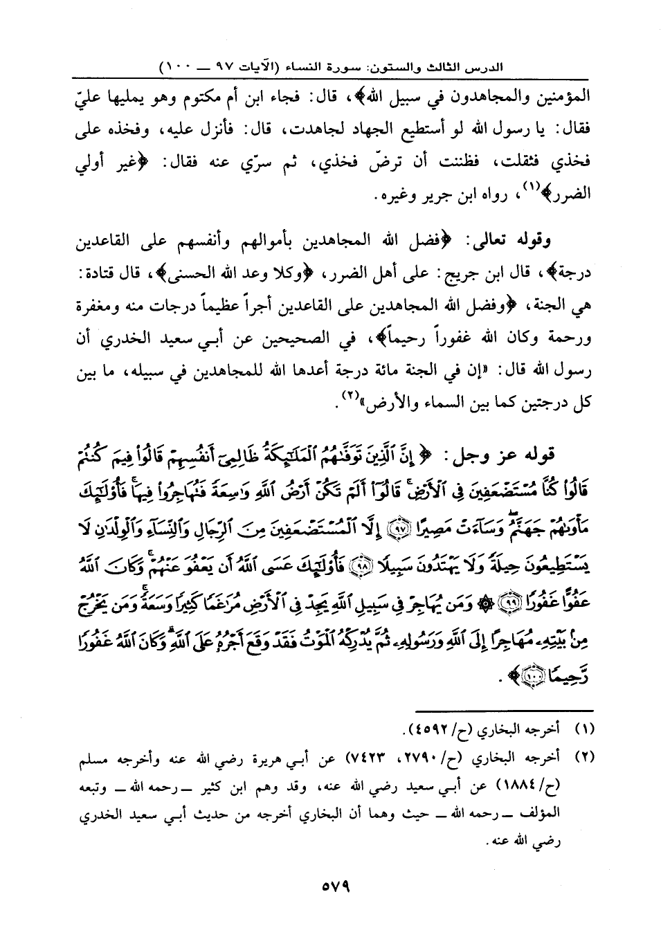 قوله عز وجل: {إِنَّ الَّذِينَ تَوَفَّاهُمُ الْمَلآئِكَةُ ظَالِمِي أَنْفُسِهِمْ قَالُواْ فِيمَ كُنتُمْ قَالُواْ كُنَّا مُسْتَضْعَفِينَ فِي الأَرْضِ قَالْوَاْ أَلَمْ تَكُنْ أَرْضُ اللهِ وَاسِعَةً فَتُهَاجِرُواْ فِيهَا فَأُوْلَئِكَ مَأْوَاهُمْ جَهَنَّمُ وَسَاءتْ مَصِيراً (97) إِلا الْمُسْتَضْعَفِينَ مِنَ الرِّجَالِ وَالنِّسَاء وَالْوِلْدَانِ لاَ يَسْتَطِيعُونَ حِيلَةً وَلاَ يَهْتَدُونَ سَبِيلاً (98) فَأُوْلَئِكَ عَسَى اللهُ أَن يَعْفُوَ عَنْهُمْ وَكَانَ اللهُ عَفُوّاً غَفُوراً (99) وَمَن يُهَاجِرْ فِي سَبِيلِ اللهِ يَجِدْ فِي الأَرْضِ مُرَاغَماً كَثِيراً وَسَعَةً وَمَن يَخْرُجْ مِن بَيْتِهِ مُهَاجِراً إِلَى اللهِ وَرَسُولِهِ ثُمَّ يُدْرِكْهُ الْمَوْتُ فَقَدْ وَقَعَ أَجْرُهُ عَلى اللهِ وَكَانَ اللهُ غَفُوراً رَّحِيماً (100) } .