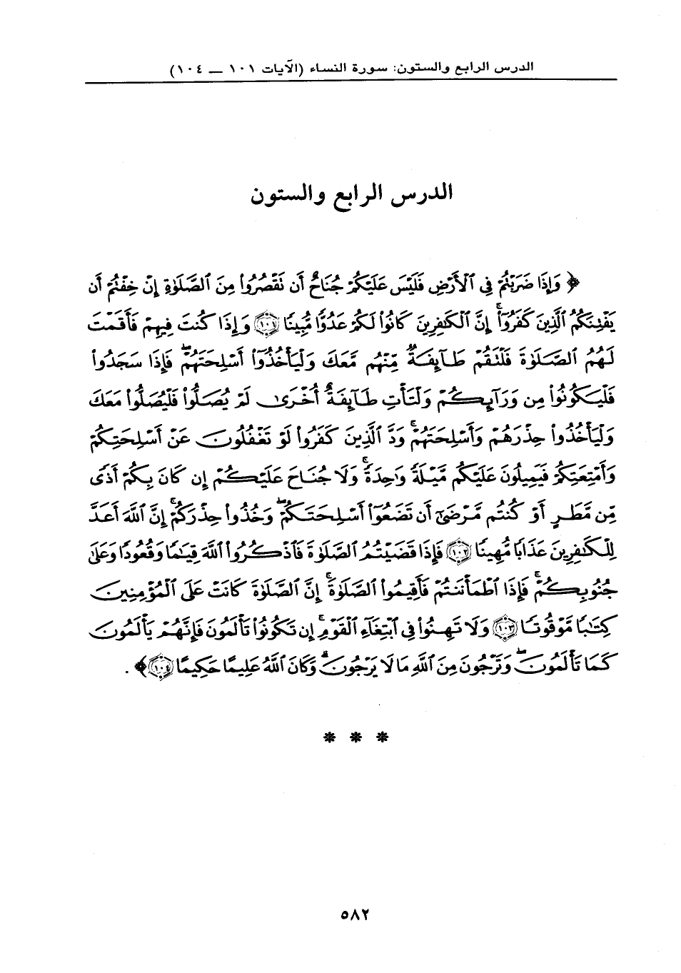 {وَإِذَا ضَرَبْتُمْ فِي الأَرْضِ فَلَيْسَ عَلَيْكُمْ جُنَاحٌ أَن تَقْصُرُواْ مِنَ الصَّلاَةِ إِنْ خِفْتُمْ أَن يَفْتِنَكُمُ الَّذِينَ كَفَرُواْ إِنَّ الْكَافِرِينَ كَانُواْ لَكُمْ عَدُوّاً مُّبِيناً (101) وَإِذَا كُنتَ فِيهِمْ فَأَقَمْتَ لَهُمُ الصَّلاَةَ فَلْتَقُمْ طَآئِفَةٌ مِّنْهُم مَّعَكَ وَلْيَأْخُذُواْ أَسْلِحَتَهُمْ فَإِذَا سَجَدُواْ فَلْيَكُونُواْ مِن وَرَآئِكُمْ وَلْتَأْتِ طَآئِفَةٌ أُخْرَى لَمْ يُصَلُّواْ فَلْيُصَلُّواْ مَعَكَ وَلْيَأْخُذُواْ حِذْرَهُمْ وَأَسْلِحَتَهُمْ وَدَّ الَّذِينَ كَفَرُواْ لَوْ تَغْفُلُونَ عَنْ أَسْلِحَتِكُمْ وَأَمْتِعَتِكُمْ فَيَمِيلُونَ عَلَيْكُم مَّيْلَةً وَاحِدَةً وَلاَ جُنَاحَ عَلَيْكُمْ إِن كَانَ بِكُمْ أَذًى مِّن مَّطَرٍ أَوْ كُنتُم مَّرْضَى أَن تَضَعُواْ أَسْلِحَتَكُمْ وَخُذُواْ حِذْرَكُمْ إِنَّ اللهَ أَعَدَّ لِلْكَافِرِينَ عَذَاباً مُّهِيناً (102) فَإِذَا قَضَيْتُمُ الصَّلاَةَ فَاذْكُرُواْ اللهَ قِيَاماً وَقُعُوداً وَعَلَى جُنُوبِكُمْ فَإِذَا اطْمَأْنَنتُمْ فَأَقِيمُواْ الصَّلاَةَ إِنَّ الصَّلاَةَ كَانَتْ عَلَى الْمُؤْمِنِينَ كِتَاباً مَّوْقُوتاً (103) وَلاَ تَهِنُواْ فِي ابْتِغَاء الْقَوْمِ إِن تَكُونُواْ تَأْلَمُونَ فَإِنَّهُمْ يَأْلَمُونَ كَمَا تَأْلَمونَ وَتَرْجُونَ مِنَ اللهِ مَا لاَ يَرْجُونَ وَكَانَ اللهُ عَلِيماً حَكِيماً (104) } .