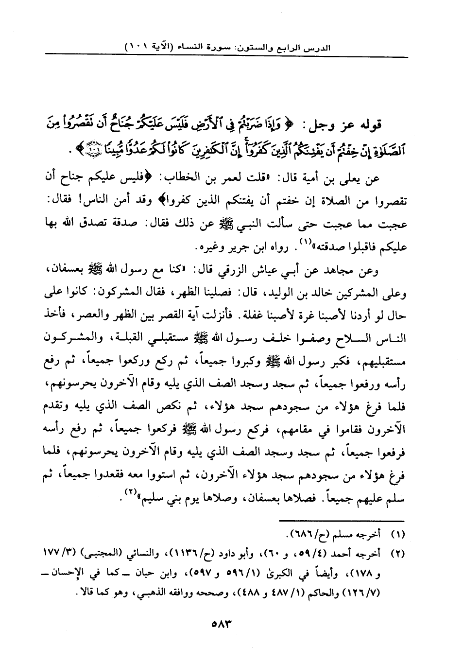 وعن مجاهد عن أبي عياش الزرقي قال: (كنا مع رسول الله - صلى الله عليه وسلم - بعسفان، وعلى المشركين خالد بن الوليد، قال: فصلينا الظهر، فقال المشركون: كانوا على حال لو أردنا لأصبنا غرة لأصبنا غفلة. فأنزلت آية القصر بين الظهر، والعصر، فأخذ الناس السلاح وصفوا خلف رسول الله - صلى الله عليه وسلم - مستقبلي القبلة، والمشركون مستقبليهم، فكبر رسول الله - صلى الله عليه وسلم - وكبروا جميعًا، ثم ركع وركعوا جميعًا، ثم رفع رأسه ورفعوا جميعًا، ثم سجد وسجد الصف الذي يليه وقام الآخرون يحرسونهم، فلما فرغ هؤلاء من سجودهم سجد هؤلاء، ثم نكص الصف الذي يليه وتقدم الآخرون فقاموا في مقامهم، فركع رسول الله - صلى الله عليه وسلم - فركعوا جميعًا، ثم رفع رأسه فرفعوا جميعًا، ثم سجد وسجد الصف الذي يليه، وقام الآخرون يحرسونهم، فلما فرغ هؤلاء من سجودهم سجد هؤلاء الآخرون، ثم استووا معه فقعدوا جميعًا، ثم سلم عليهم جميعًا , فصلاها بعسفان، وصلاها يوم بني سليم) .