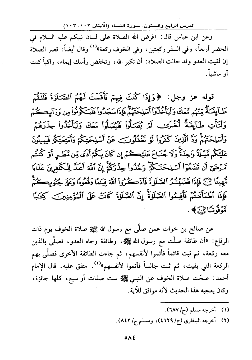 وعن ابن عباس قال: (فرض الله الصلاة على لسان نبيكم عليه السلام في الحضر أربعًا، وفي السفر ركعتين، وفي الخوف ركعة) وقال أيضًا: قصر الصلاة إن لقيت العدو وقد حانت الصلاة أن تكبر الله، وتخفض رأسك إيماء، راكبًا كنت أو ماشيًا.