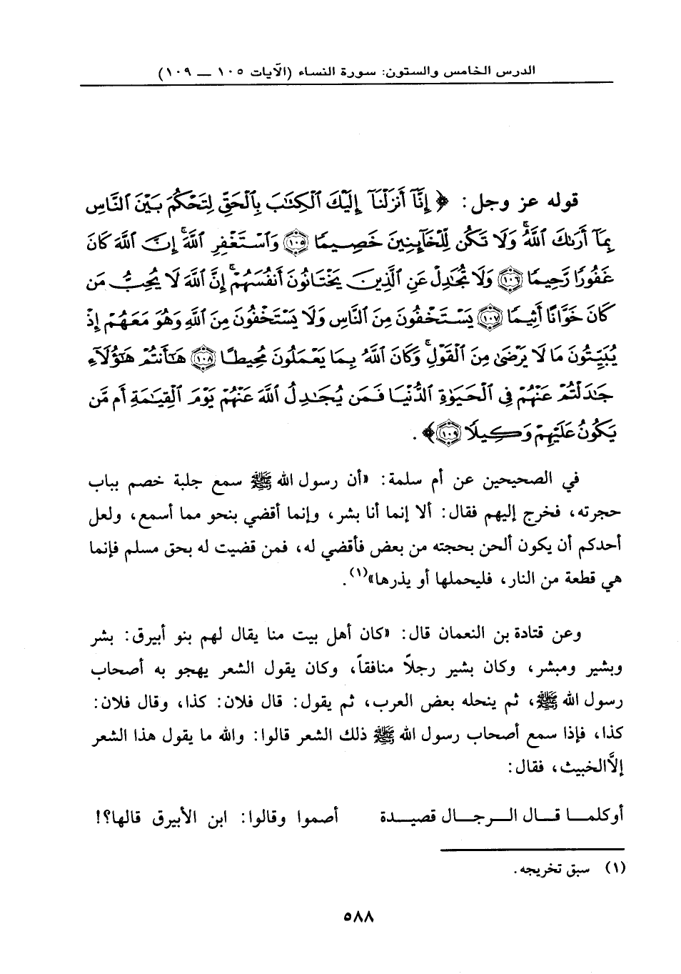 وعن قتادة: بن النعمان قال: كان أهل بيت منا يقال لهم بنو أبيرق: بشر وبشير ومبشر، وكان بشير رجلاً منافقًا، وكان يقول: الشعر يهجو به أصحاب رسول الله - صلى الله عليه وسلم -، ثم ينحله بعض العرب، ثم يقول: قال فلان: كذا، وقال فلان: كذا، فإذا سمع أصحاب رسول الله - صلى الله عليه وسلم - ذلك الشعر قالوا: والله ما يقول هذا الشعر إلا الخبيث، فقال: