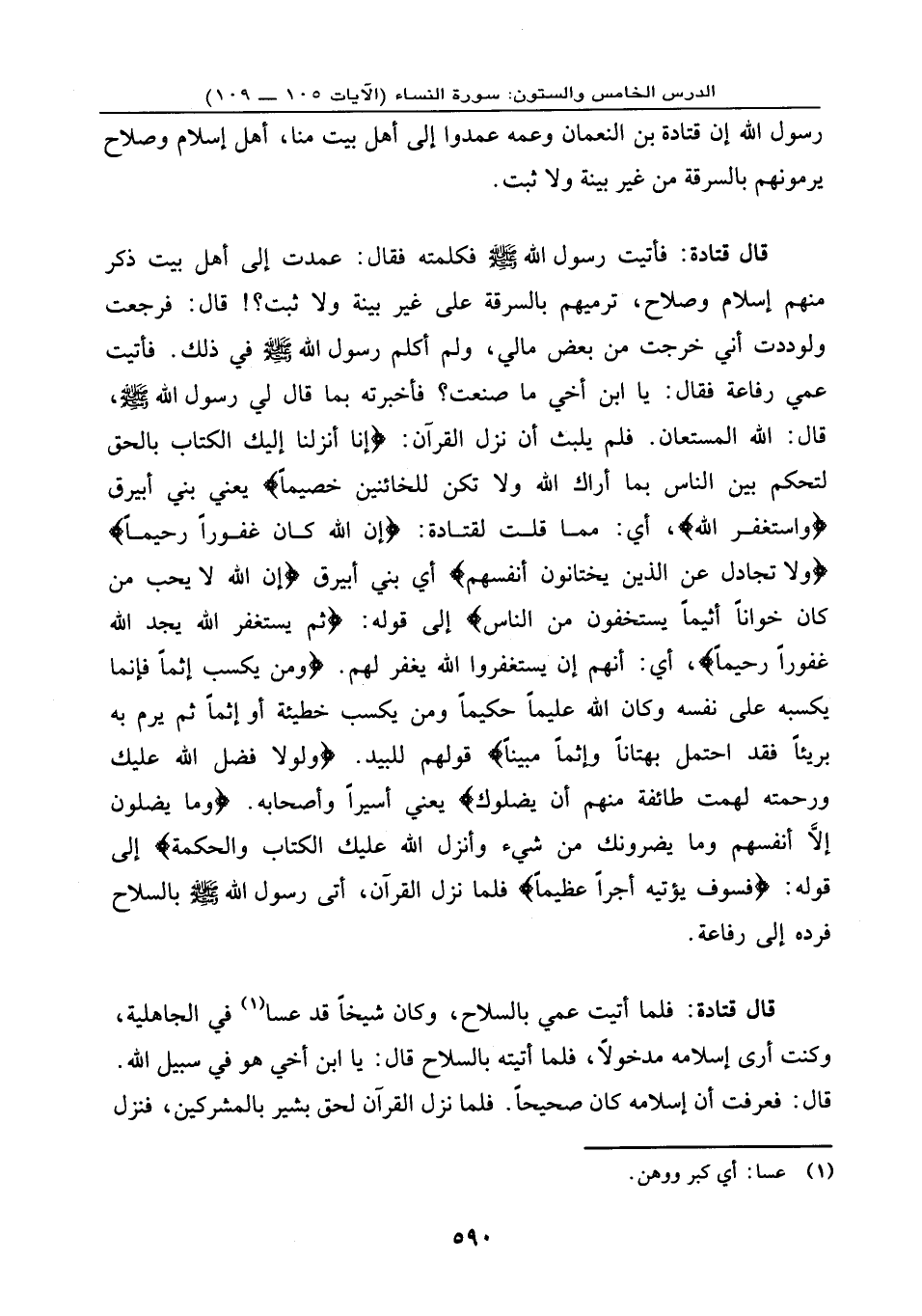 قال قتادة: فأتيت رسول الله - صلى الله عليه وسلم - فكلمته فقال: «عمدت إلى أهل بيت ذكر منهم إسلام وصلاح، ترميهم بالسرقة على غير بينة ولا ثبت» ؟ ! قال: فرجعت ولوددت أني خرجت من بعض مالي، ولم أكلم رسول الله - صلى الله عليه وسلم - في ذلك. فأتيت عمي رفاعة فقال: يا ابن أخي ما صنعت؟ فأخبرته بما قال لي رسول الله - صلى الله عليه وسلم - قال: الله المستعان. فلم يلبث أن نزل القرآن: {إِنَّا أَنزَلْنَا إِلَيْكَ الْكِتَابَ بِالْحَقِّ لِتَحْكُمَ بَيْنَ النَّاسِ بِمَا أَرَاكَ اللهُ وَلاَ تَكُن لِّلْخَآئِنِينَ خَصِيماً} ، يعني: بني أبيرق، {وَاسْتَغْفِرِ اللهَ} ، أي: مما قلت لقتادة: {إِنَّ اللهَ كَانَ غَفُوراً رَّحِيماً} ، {وَلاَ تُجَادِلْ عَنِ الَّذِينَ يَخْتَانُونَ أَنفُسَهُمْ} أي: بني أبيرق، {إِنَّ اللهَ لاَ يُحِبُّ مَن كَانَ خَوَّاناً أَثِيماً يَسْتَخْفُونَ مِنَ النَّاسِ} إلى قوله: {ثُمَّ يَسْتَغْفِرِ اللهَ يَجِدِ اللهَ غَفُوراً رَّحِيماً} ، أي: أنهم إن يستغفروا الله يغفر لهم. {وَمَن يَكْسِبْ إِثْماً فَإِنَّمَا يَكْسِبُهُ عَلَى نَفْسِهِ وَكَانَ اللهُ عَلِيماً حَكِيماً * وَمَن يَكْسِبْ خَطِيئَةً أَوْ إِثْماً ثُمَّ يَرْمِ بِهِ بَرِيئاً فَقَدِ احْتَمَلَ بُهْتَاناً وَإِثْماً مُّبِيناً} قولهم للبيد. {وَلَوْلاَ فَضْلُ اللهِ عَلَيْكَ وَرَحْمَتُهُ لَهَمَّت طَّآئِفَةٌ مُّنْهُمْ أَن يُضِلُّوكَ} ، يعني: أسيرًا وأصحابه. {وَمَا يُضِلُّونَ إِلاُّ أَنفُسَهُمْ وَمَا يَضُرُّونَكَ مِن شَيْءٍ وَأَنزَلَ اللهُ عَلَيْكَ الْكِتَابَ وَالْحِكْمَةَ}