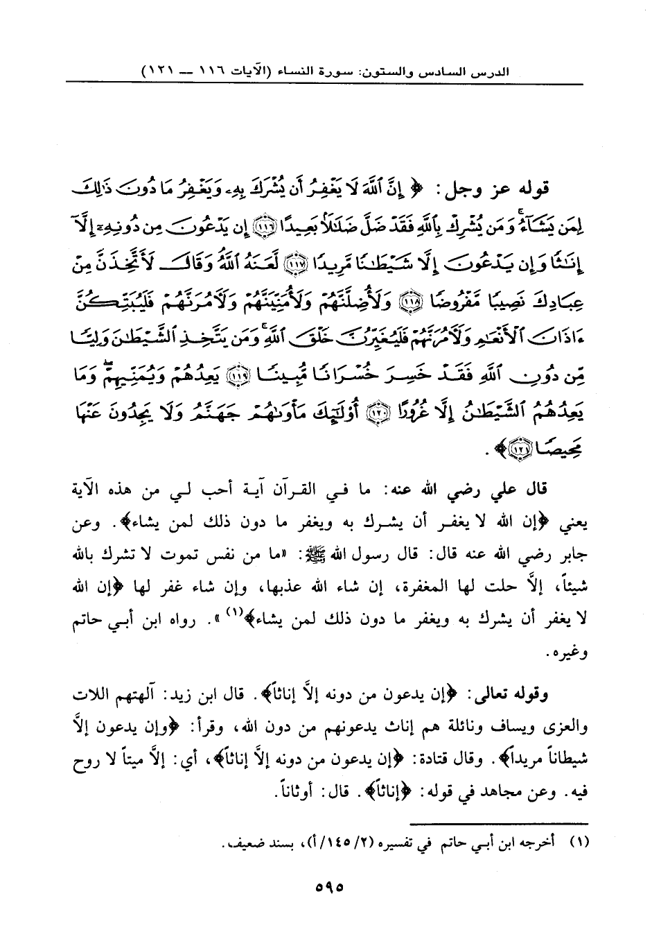 قال علي رضي الله عنه: ما في القرآن آية أحب لي من هذه الآية يعني: {إِنَّ اللهَ لاَ يَغْفِرُ أَن يُشْرَكَ بِهِ وَيَغْفِرُ مَا دُونَ ذَلِكَ لِمَن يَشَاءُ} . وعن جابر رضي الله عنه قال: قال رسول الله - صلى الله عليه وسلم -: «ما من نفس تموت لا تشرك بالله شيئًا، إلا حلت لها المغفرة، إن شاء الله عذبها، وإن شاء الله غفر لها {إِنَّ اللهَ لاَ يَغْفِرُ أَن يُشْرَكَ بِهِ وَيَغْفِرُ مَا دُونَ ذَلِكَ لِمَن يَشَاءُ} » . رواه ابن أبي حاتم وغيره.