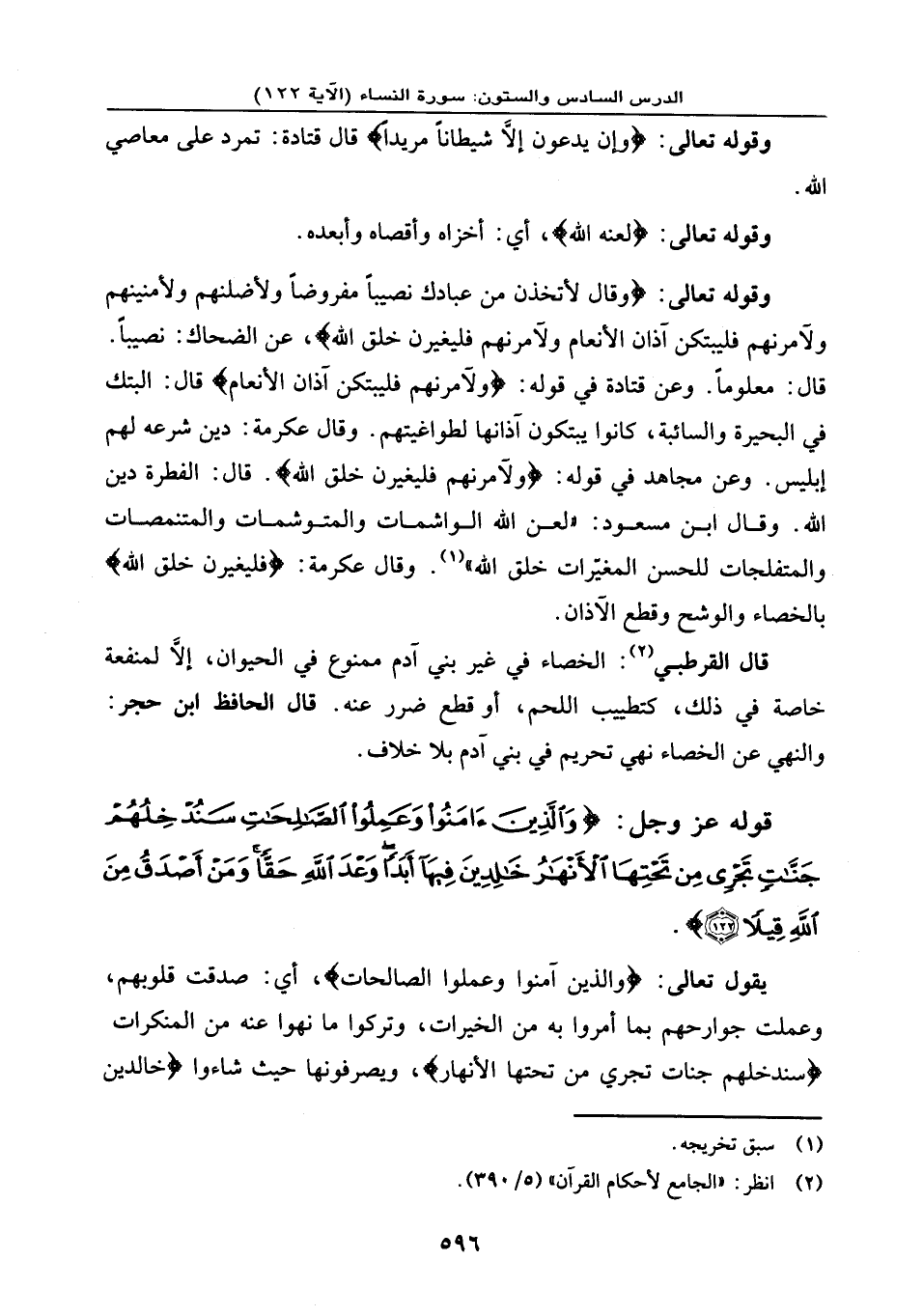 وقوله تعالى: {وَقَالَ لَأَتَّخِذَنَّ مِنْ عِبَادِكَ نَصِيباً مَّفْرُوضاً * وَلأُضِلَّنَّهُمْ وَلأُمَنِّيَنَّهُمْ وَلآمُرَنَّهُمْ فَلَيُبَتِّكُنَّ آذَانَ الأَنْعَامِ وَلآمُرَنَّهُمْ فَلَيُغَيِّرُنَّ خَلْقَ اللهِ} ، عن الضحاك: نصيبًا. قال: معلومًا. وعن قتادة في قوله: {وَلآمُرَنَّهُمْ فَلَيُبَتِّكُنَّ آذَانَ الأَنْعَامِ} ، قال: البتك في البحيرة والسائبة، كانوا يبتكون آذانها لطواغيتهم. وقال عكرمة: دين شرعه لهم إبليس. وعن مجاهد في قوله: {وَلآمُرَنَّهُمْ فَلَيُغَيِّرُنَّ خَلْقَ اللهِ} . قال: الفطرة دين الله. وقال ابن مسعود: (لعن الله: الواشمات، والمتوشمات، والمتنمصات، والمتفلجات للحسن المغيّرات خلق الله) . وقال عكرمة: {فَلَيُغَيِّرُنَّ خَلْقَ اللهِ} ، بالخصاء، والوشح، وقطع الآذان.