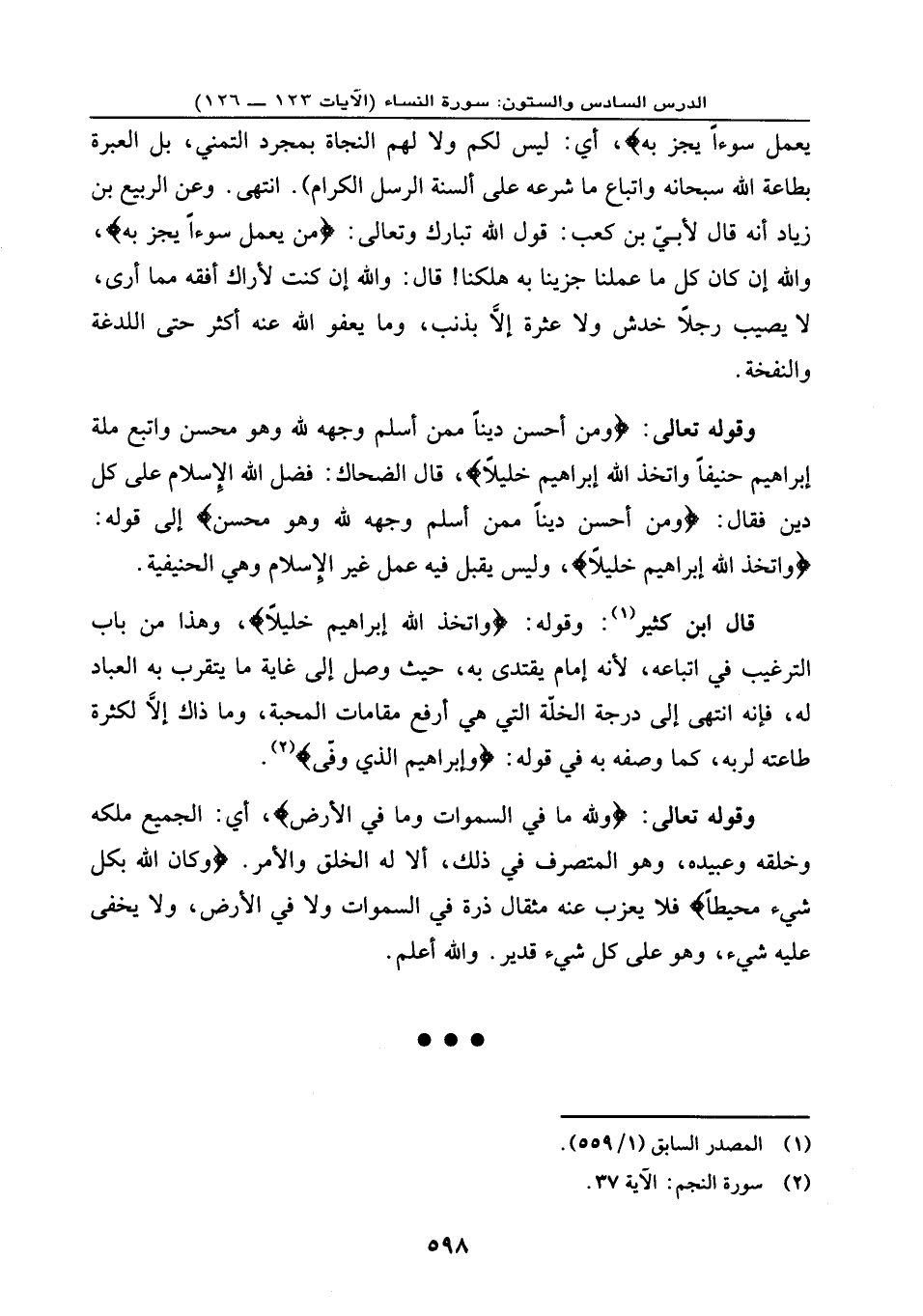 يَعْمَلْ سُوءاً يُجْزَ بِهِ} ، أي: ليس لكم ولا لهم النجاة بمجرد التمني، بل العبرة بطاعة الله سبحانه، وإتباع ما شرعه على ألسنة الرسل الكرام) . انتهى. وعن الربيع بن زياد أنه قال لأبيّ بن كعب: قول الله تبارك وتعالى: {مَن يَعْمَلْ سُوءاً يُجْزَ بِهِ} والله إن كان كل ما عملنا جزينا به هلكنا! قال: والله إن كنت لأراك أفقه مما أرى، لا يصيب رجلاً خدش ولا عثرة إلا بذنب، وما يعفوا الله عنه أكثر حتى اللدغة والنفخة.