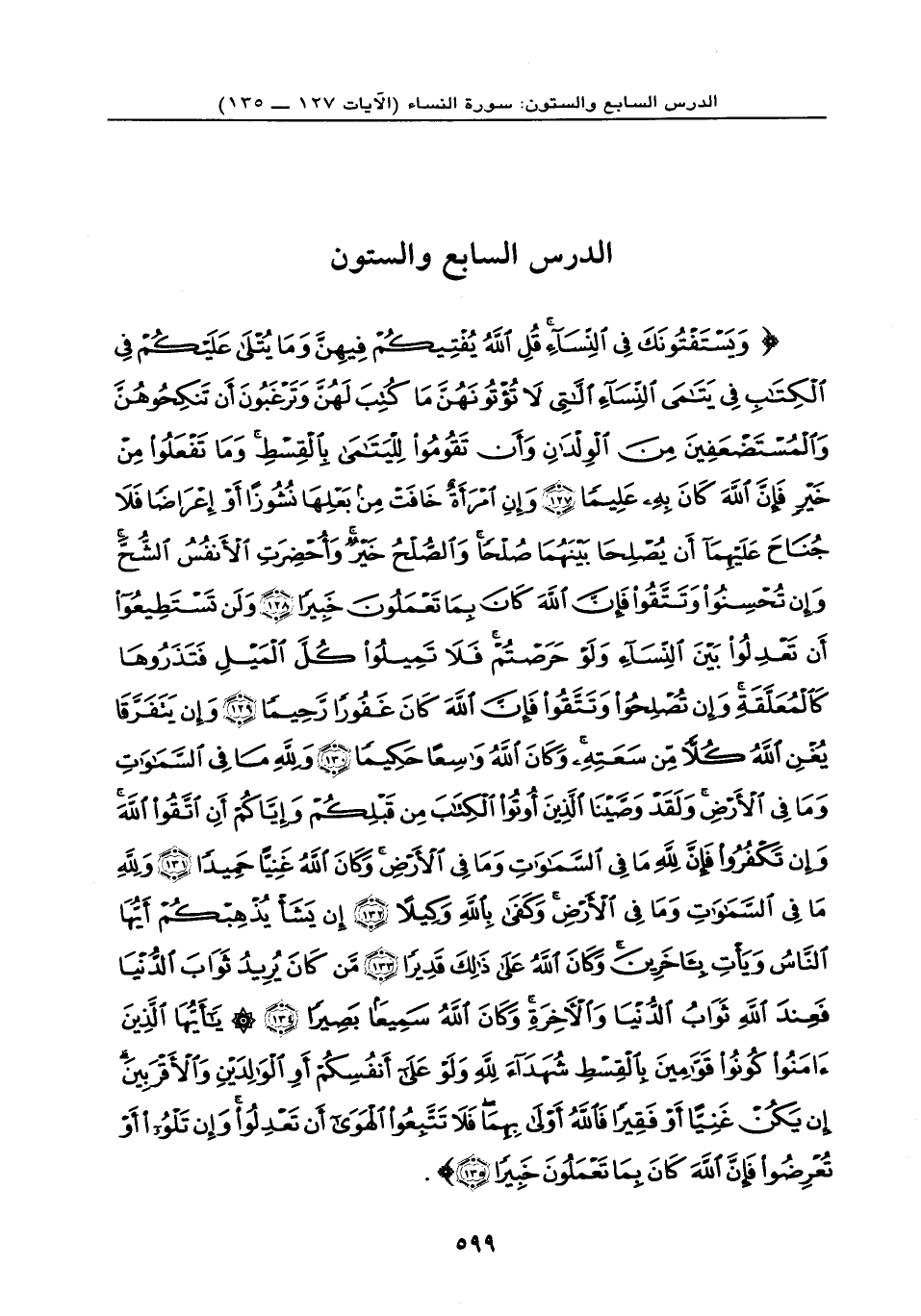 {وَيَسْتَفْتُونَكَ فِي النِّسَاء قُلِ اللهُ يُفْتِيكُمْ فِيهِنَّ وَمَا يُتْلَى عَلَيْكُمْ فِي الْكِتَابِ فِي يَتَامَى النِّسَاء الَّلاتِي لاَ تُؤْتُونَهُنَّ مَا كُتِبَ لَهُنَّ وَتَرْغَبُونَ أَن تَنكِحُوهُنَّ وَالْمُسْتَضْعَفِينَ مِنَ الْوِلْدَانِ وَأَن تَقُومُواْ لِلْيَتَامَى بِالْقِسْطِ وَمَا تَفْعَلُواْ مِنْ خَيْرٍ فَإِنَّ اللهَ كَانَ بِهِ عَلِيماً (127) وَإِنِ امْرَأَةٌ خَافَتْ مِن بَعْلِهَا نُشُوزاً أَوْ إِعْرَاضاً فَلاَ جُنَاْحَ عَلَيْهِمَا أَن يُصْلِحَا بَيْنَهُمَا صُلْحاً وَالصُّلْحُ خَيْرٌ وَأُحْضِرَتِ الأَنفُسُ الشُّحَّ وَإِن تُحْسِنُواْ وَتَتَّقُواْ فَإِنَّ اللهَ كَانَ بِمَا تَعْمَلُونَ خَبِيراً (128) وَلَن تَسْتَطِيعُواْ أَن تَعْدِلُواْ بَيْنَ النِّسَاء وَلَوْ حَرَصْتُمْ فَلاَ تَمِيلُواْ كُلَّ الْمَيْلِ فَتَذَرُوهَا كَالْمُعَلَّقَةِ وَإِن تُصْلِحُواْ وَتَتَّقُواْ فَإِنَّ اللهَ كَانَ غَفُوراً رَّحِيماً (129) وَإِن يَتَفَرَّقَا يُغْنِ اللهُ كُلاًّ مِّن سَعَتِهِ وَكَانَ اللهُ وَاسِعاً حَكِيماً (130) وَللهِ مَا فِي السَّمَاوَاتِ وَمَا فِي الأَرْضِ وَلَقَدْ وَصَّيْنَا الَّذِينَ أُوتُواْ الْكِتَابَ مِن قَبْلِكُمْ وَإِيَّاكُمْ أَنِ اتَّقُواْ اللهَ وَإِن تَكْفُرُواْ فَإِنَّ لِلّهِ مَا فِي السَّمَاوَاتِ وَمَا فِي الأَرْضِ وَكَانَ اللهُ غَنِيّاً حَمِيداً (131) وَلِلّهِ مَا فِي السَّمَاوَاتِ وَمَا فِي الأَرْضِ وَكَفَى بِاللهِ وَكِيلاً (132) إِن يَشَأْ يُذْهِبْكُمْ أَيُّهَا النَّاسُ وَيَأْتِ بِآخَرِينَ وَكَانَ اللهُ عَلَى ذَلِكَ قَدِيراً (133) مَّن كَانَ يُرِيدُ ثَوَابَ الدُّنْيَا فَعِندَ اللهِ ثَوَابُ الدُّنْيَا وَالآخِرَةِ وَكَانَ اللهُ سَمِيعاً بَصِيراً (134) يَا أَيُّهَا الَّذِينَ آمَنُواْ كُونُواْ قَوَّامِينَ بِالْقِسْطِ شُهَدَاء لِلّهِ وَلَوْ عَلَى أَنفُسِكُمْ أَوِ الْوَالِدَيْنِ وَالأَقْرَبِينَ إِن يَكُنْ غَنِيّاً أَوْ فَقَيراً فَاللهُ أَوْلَى بِهِمَا فَلاَ تَتَّبِعُواْ الْهَوَى أَن