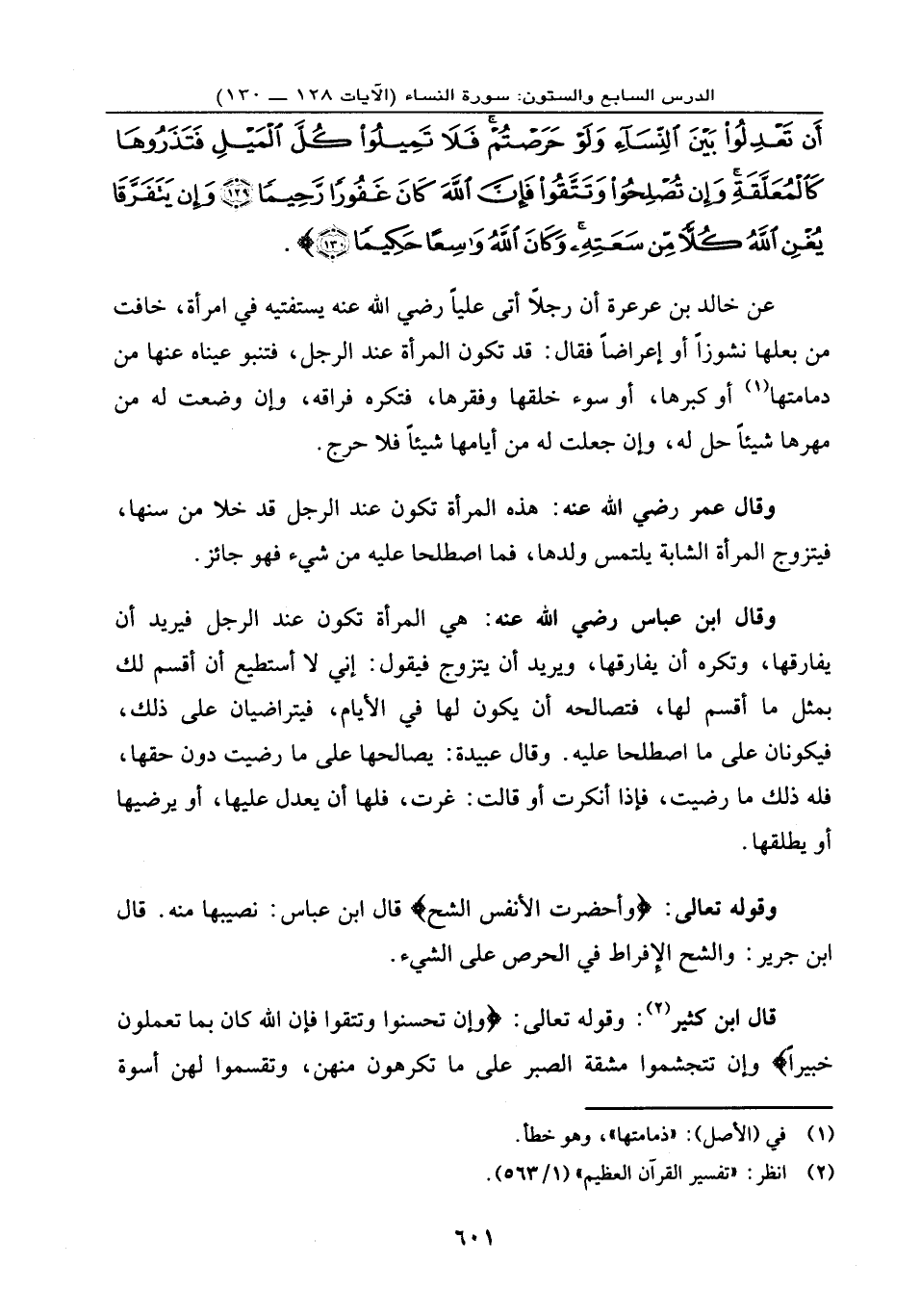 أَن تَعْدِلُواْ بَيْنَ النِّسَاء وَلَوْ حَرَصْتُمْ فَلاَ تَمِيلُواْ كُلَّ الْمَيْلِ فَتَذَرُوهَا كَالْمُعَلَّقَةِ وَإِن تُصْلِحُواْ وَتَتَّقُواْ فَإِنَّ اللهَ كَانَ غَفُوراً رَّحِيماً (129) وَإِن يَتَفَرَّقَا يُغْنِ اللهُ كُلاًّ مِّن سَعَتِهِ وَكَانَ اللهُ وَاسِعاً حَكِيماً (130) } .