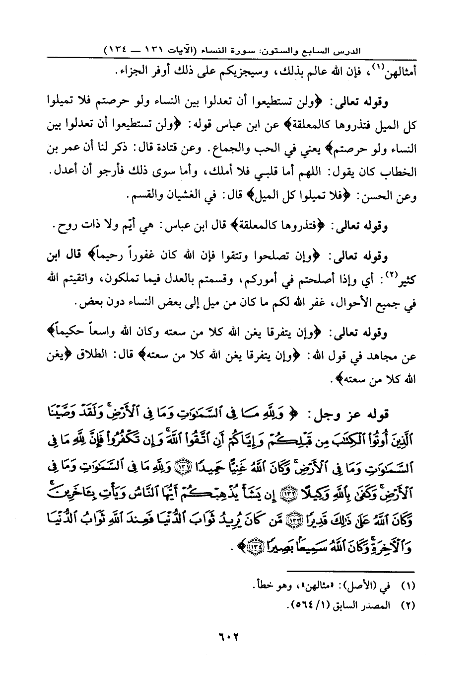 وقوله تعالى: {وَلَن تَسْتَطِيعُواْ أَن تَعْدِلُواْ بَيْنَ النِّسَاء وَلَوْ حَرَصْتُمْ فَلاَ تَمِيلُواْ كُلَّ الْمَيْلِ فَتَذَرُوهَا كَالْمُعَلَّقَةِ} ، عن ابن عباس قوله: {وَلَن تَسْتَطِيعُواْ أَن تَعْدِلُواْ بَيْنَ النِّسَاء وَلَوْ حَرَصْتُمْ} ، يعني: في الحب والجماع. وعن قتادة قال: ذكر لنا أن عمر بن الخطاب كان يقول: اللهم أما قلبي فلا أملك، وأما سوى ذلك فأرجوا أن أعدل. وعن الحسن: {فَلاَ تَمِيلُواْ كُلَّ الْمَيْلِ} ، قال: في الغشيان والقسم.