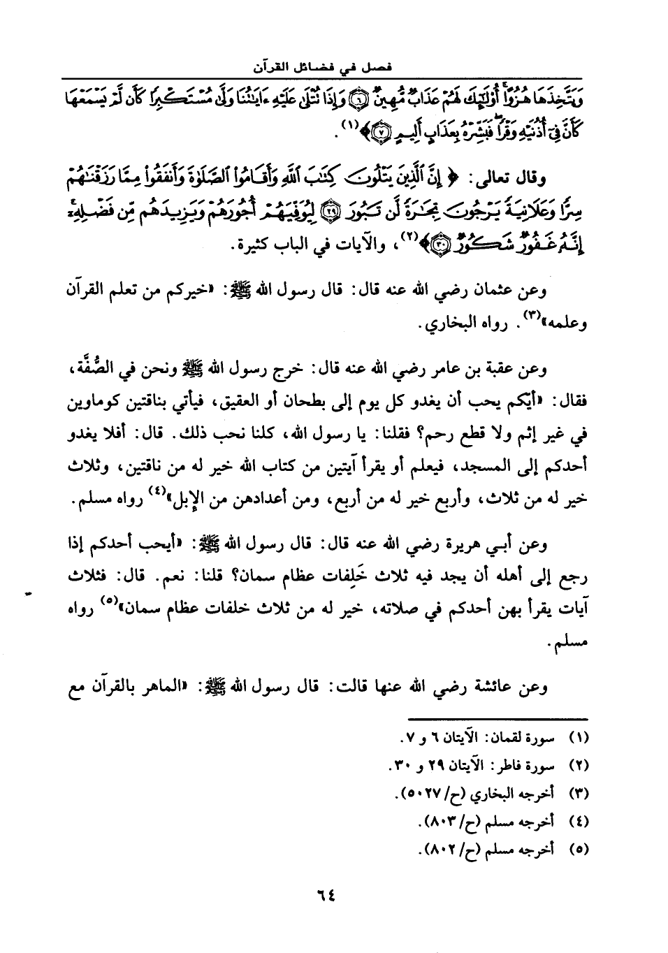 وعن عثمان رضي الله عنه قال: قال رسول الله - صلى الله عليه وسلم -: «خيركم من تعلم القرآن وعلمه» . رواه البخاري.