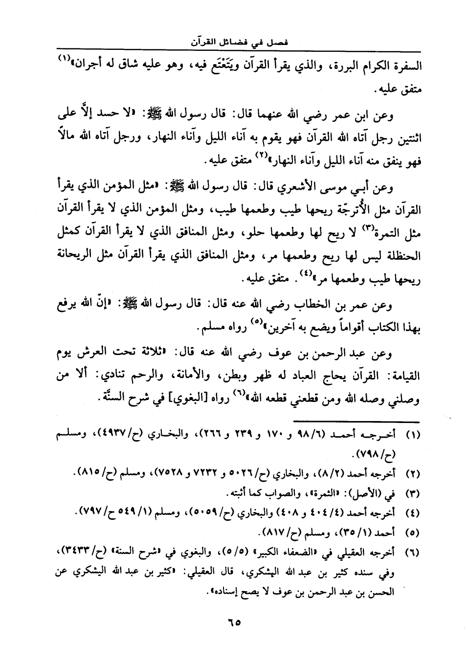 وعن أبي موسى الأشعري قال: قال رسول الله - صلى الله عليه وسلم -: «مثل المؤمن الذي يقرأ القرآن مثل الأُترجّة ريحها طيب وطعمها طيب، ومثل المؤمن الذي لا يقرأ القرآن مثل التمرة لا ريح لها وطعمها حلو، ومثل المنافق الذي لا يقرأ القرآن كمثل الحنظلة ليس لها ريح وطعمها مر، ومثل المنافق الذي يقرأ القرآن مثل الريحانة ريحها طيب وطعمها مر» . متفق عليه.