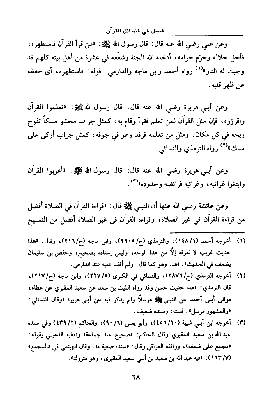 وعن علي رضي الله عنه قال: قال رسول الله - صلى الله عليه وسلم -: «من قرأ القرآن فاستظهره، فأحل حلاله وحرم حرامه، أدخله الله الجنة وشفّعه في عشرة من أهل بيته كلهم قد وجبت له النار» . رواه أحمد، وابن ماجة، والدرامي. قوله: فاستظهره، أي: حفظه عن ظهر قلبه.