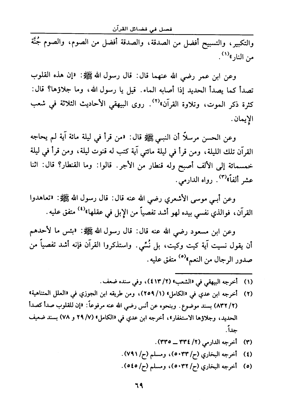 وعن ابن عمر رضي الله عنهما قال: قال رسول الله - صلى الله عليه وسلم -: «إن هذه القلوب تصدأ كما يصدأ الحديد إذا أصابه الماء. قيل يا رسول الله: وما جلاؤها؟ قال: «كثرة ذكر الموت، وتلاوة القرآن» . روى البيهقي الأحاديث الثلاثة في شعب الإيمان.