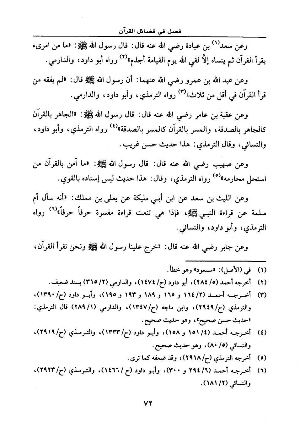 وعن عبد الله بن عمرو رضي الله عنهما أن رسول الله - صلى الله عليه وسلم - قال: «لم يفقه من قرأ القرآن في أقل من ثلاث» . رواه الترمذي، وأبو داود، والدارمي.