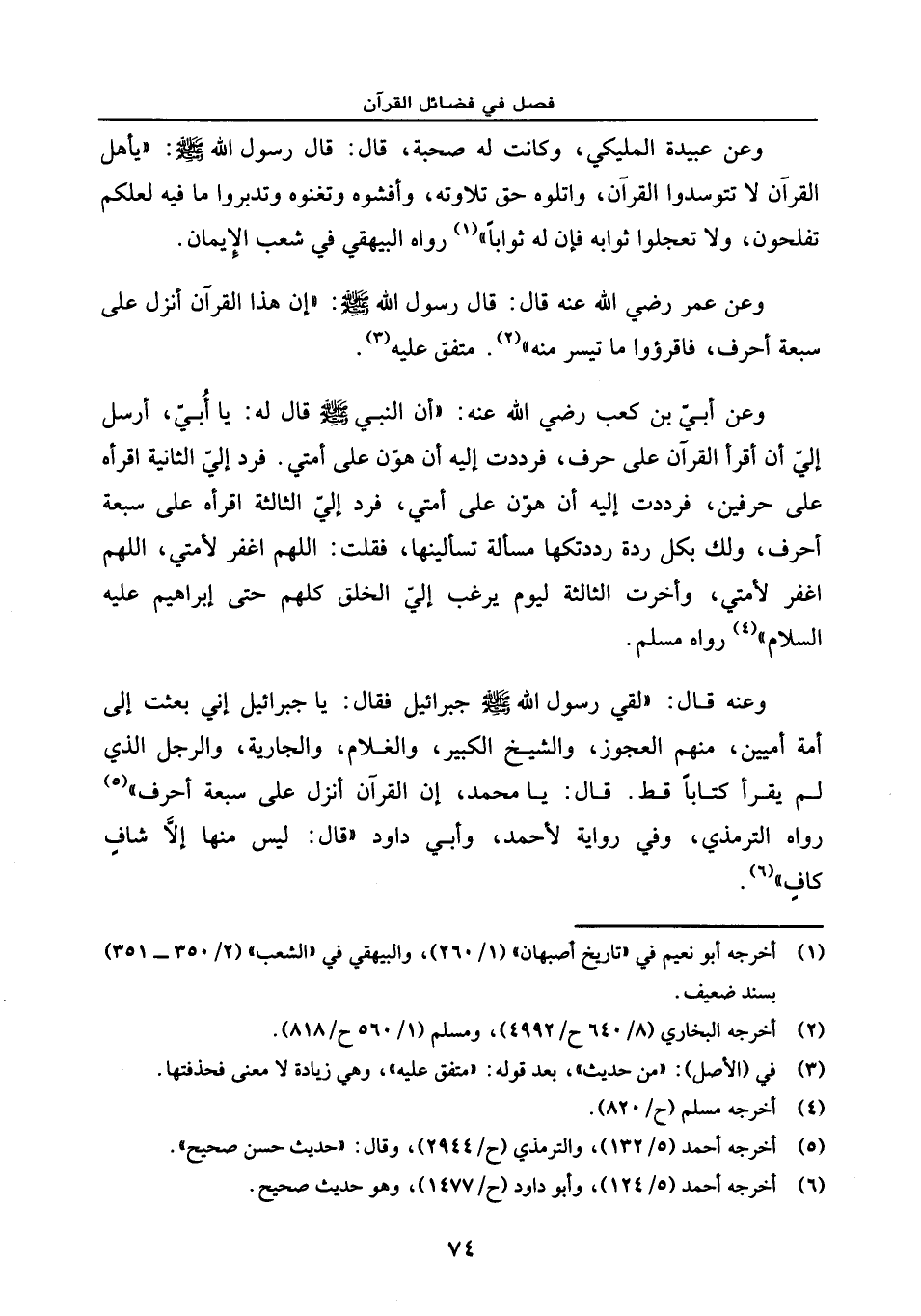 وعنه قال: (لقي رسول الله - صلى الله عليه وسلم - جبرائيل فقال: «يا جبرائيل إني بعثت إلى أمة أميين، منهم العجوز والشيخ الكبير والغلام والجارية والرجل الذي لم يقرأ كتابًا قط» . قال: (يا محمد، إن القرآن أنزل على سبعة أحرف) . رواه الترمذي، وفي رواية لأحمد، وأبي داود قال: (ليس منها إلا شافٍ كافٍ) .