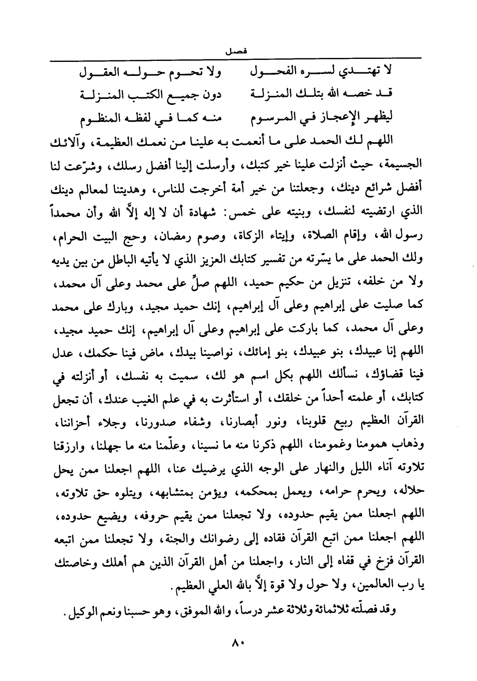 وشرّعت لنا أفضل شرائع دينك، وجعلتنا من خير أمة أخرجت للناس، وهديتنا لمعالم دينك الذي ارتضيته لنفسك، وبنيته على خمس: شهادة أن لا إله إلا الله وأن محمدًا رسول الله، وإقام الصلاة، وإيتاء الزكاة، وصوم رمضان، وحج البيت الحرام، ولك الحمد على ما يسّرته من تفسير كتابك العزيز الذي لا يأتيه الباطل من بين يديه ولا من خلفه، تنزيل من حكيم حميد، اللهم صلِّ على محمد وعلى آل محمد، كما صليت على إبراهيم وعلى آل إبراهيم، إنك حميد مجيد، وبارك على محمد، وعلى آل محمد كما باركت على إبراهيم وعلى آل إبراهيم، إنك حميد مجيد. اللهم إنا عبيدك، بنو عبيدك، بنو إمائك، نواصينا بيدك، ماض فينا حكمك، عدل فينا قضاؤك، نسألك اللهم بكل اسم هو لك، سميت به نفسك، أو أنزلته في كتابك، أو علمته أحدًا من خلقك، أو استأثرت به في علم الغيب عندك، أن تجعل القرآن العظيم ربيع قلوبنا، ونور أبصارنا، وشفاء صدورنا، وجلاء أحزاننا، وذهاب همومنا وغمومنا، اللهم ذكرنا منه ما نسينا، وعلّمنا منه ما جهلنا، وارزقنا تلاوته آناء الليل والنهار على الوجه الذي يرضيك عنا، ... اللهم اجعلنا ممن يحل حلاله، ويحرم حرامه، ويعمل بمحكمه، ويؤمن بمتشابهه، ويتلوه حق تلاوته، اللهم اجعلنا ممن يقيم حدوده، ولا تجعلنا ممن يقيم حروفه، ويضيع حدوده، اللهم اجعلنا ممن اتبع القرآن فقاده إلى رضوانك والجنة، ولا تجعلنا ممن اتبعه القرآن فزخ في قفاه إلى النار، واجعلنا من أهل القرآن الذين هم أهلك وخاصتك يا رب العالمين، ولا حول ولا قوة إلا بالله العلي العظيم.