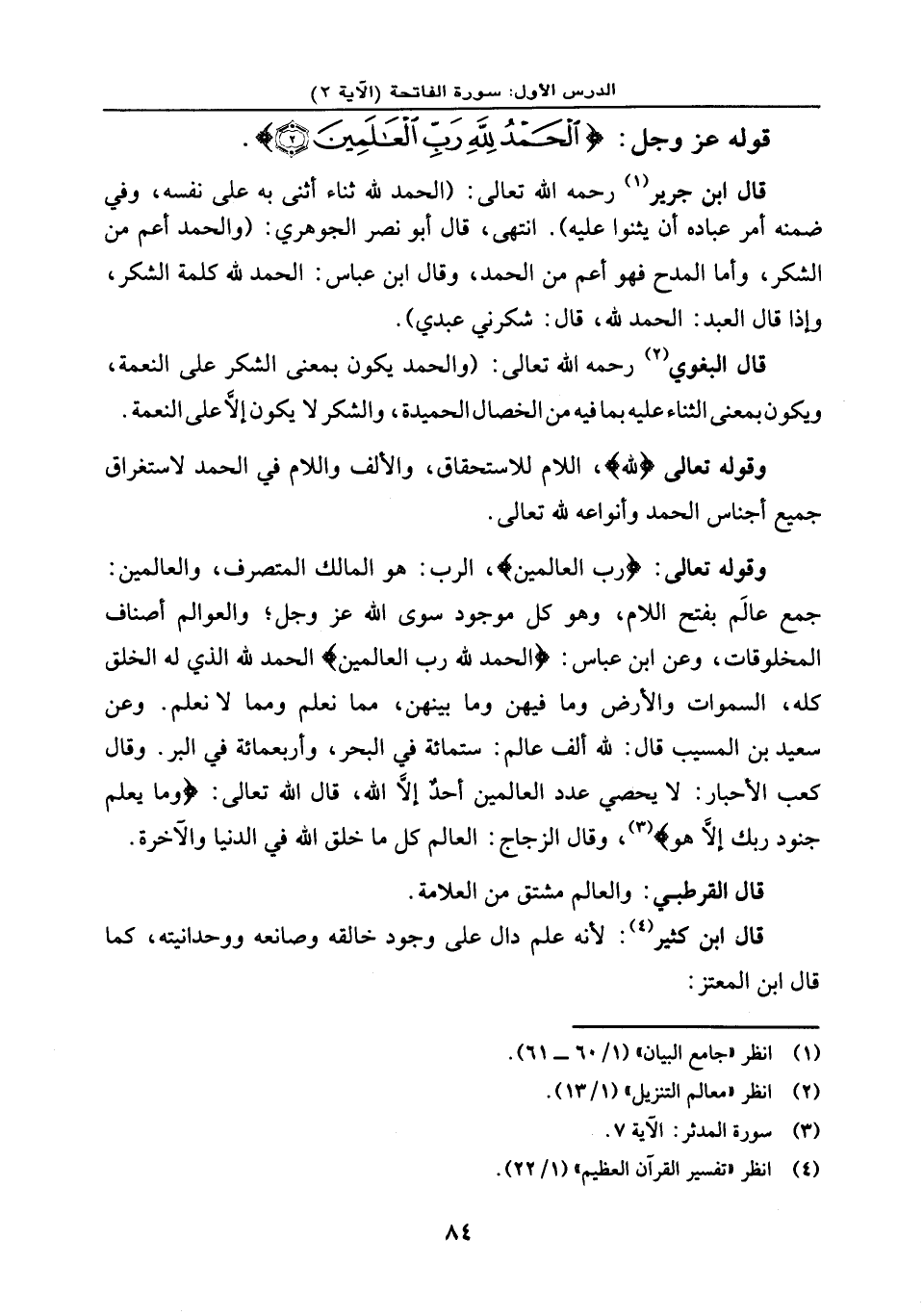 وقوله تعالى: {رَبِّ الْعَالَمِينَ} ، الرب: هو المالك المتصرف، والعالمين: جمع عالَم بفتح اللام، وهو كل موجود سوى الله عز وجل؛ والعوالم أصناف المخلوقات، وعن ابن عباس: {الْحَمْدُ للهِ رَبِّ الْعَالَمِينَ} الحمد لله الذي له الخلق كله، السماوات والأرض وما فيهن وما بينهن، مما نعلم ومما لا نعلم. وعن سعيد بن المسيب قال: لله ألف عالم: ستمائة في البحر، وأربعمائة في البر. وقال كعب الأحبار: لا يحصي عدد العالمين أحدٌ إلا الله، قال الله تعالى: {وَمَا يَعْلَمُ جُنُودَ رَبِّكَ إِلا هُوَ} ، وقال الزجاج: العالم كل ما خلق الله في الدنيا والآخرة.