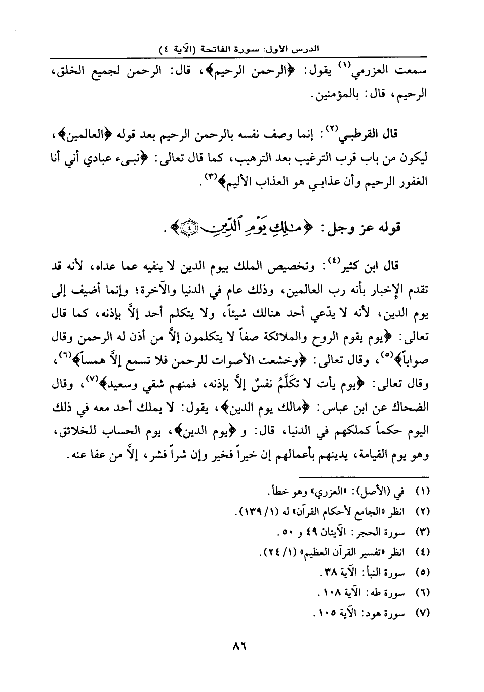 قال ابن كثير: وتخصيص الملك بيوم الدين لا ينفيه عما عاداه، لأنه قد تقدم الإخبار بأنه رب العالمين وذلك عام في الدنيا والآخرة. وإنما أضيف إلى يوم الدين لأنه لا يدعي أحد هنالك شيئًا، ولا يتكلم أحدًا إلا بإذنه كما قال تعالى: {يَوْمَ يَقُومُ الرُّوحُ وَالْمَلَائِكَةُ صَفّاً لَّا يَتَكَلَّمُونَ إِلَّا مَنْ أَذِنَ لَهُ الرحْمَنُ وَقَالَ صَوَاباً} ، وقال تعالى: {وَخَشَعَت الْأَصْوَاتُ لِلرَّحْمَنِ فَلَا تَسْمَعُ إِلَّا هَمْساً} ، وقال تعالى: {يَوْمَ يَأْتِ لاَ تَكَلَّمُ نَفْسٌ إِلا بِإِذْنِهِ فَمِنْهُمْ شَقِيٌّ وَسَعِيدٌ} ، وقال الضحاك عن ابن عباس: ... {مَالِكِ يَوْمِ الدِّينِ} يقول: لا يملك أحد معه في ذلك اليوم حكمًا كملكهم في الدنيا قال: و {يَوْمِ الدِّينِ} يوم الحساب للخلائق، وهو يوم القيامة يدينهم بأعمالهم إن خيرًا فخير، وإن شرًا فشر، إلا من عفا عنه.