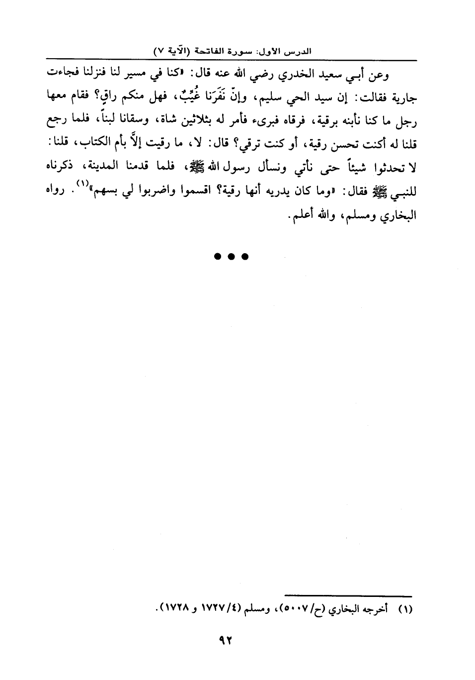 راق؟ فقام معها رجل ما كنا نأبنه برقيه فرقاه فبرئ فأمر له بثلاثين شاة، وسقانا لبنًا، فلما رجع قلنا له: أكنت تحسن رقية، أو كنت ترقي؟ قال: لا، ما رقيت إلا بأم الكتاب، قلنا: لا تحدثوا شيئًا حتى نأتي أو نسأل رسول الله - صلى الله عليه وسلم -، فلما قدمنا المدينة، ذكرناه للنبي - صلى الله عليه وسلم - فقال: «وما كان يدريه أنها رقية؟ اقسموا واضربوا لي بسهم» . رواه البخاري ومسلم، والله أعلم.