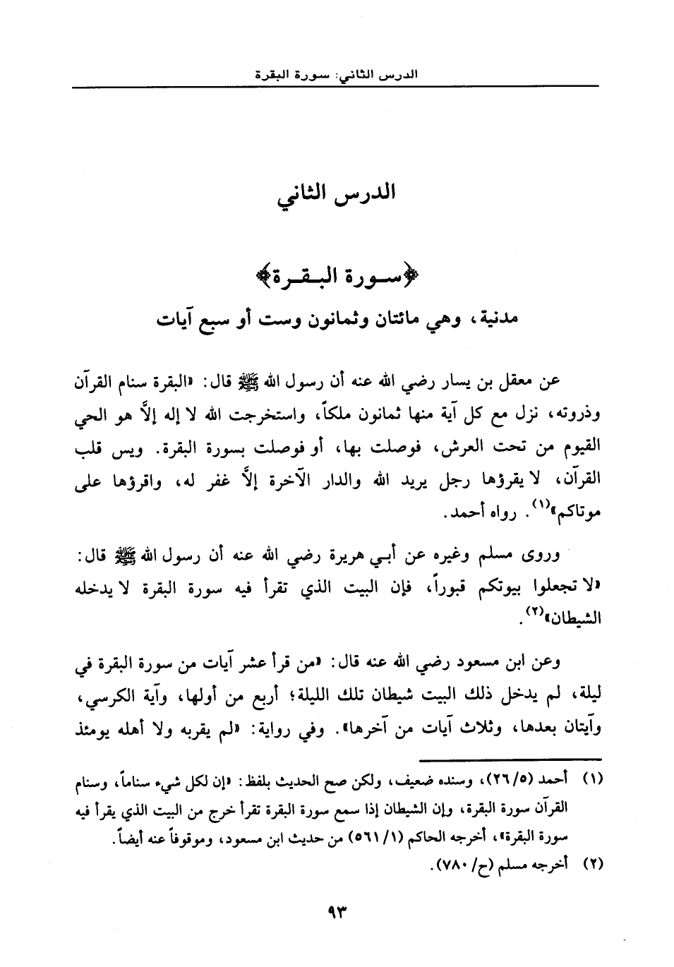 وروى مسلم وغيره عن أبي هريرة رضي الله عنه أن رسول الله - صلى الله عليه وسلم - قال: «لا تجعلوا بيوتكم قبورًا، فإن البيت الذي لا تقرأ فيه سورة البقرة لا يدخله الشيطان» .