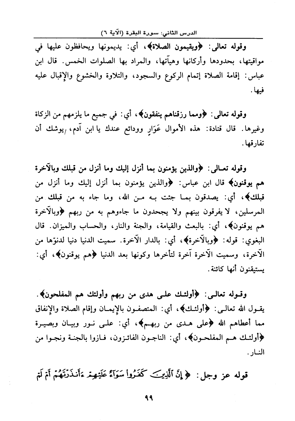 وقوله تعالى: {والَّذِينَ يُؤْمِنُونَ بِمَا أُنزِلَ إِلَيْكَ وَمَا أُنزِلَ مِن قَبْلِكَ وَبِالآخِرَةِ هُمْ يُوقِنُونَ} ، قال ابن عباس: {والَّذِينَ يُؤْمِنُونَ بِمَا أُنزِلَ إِلَيْكَ وَمَا أُنزِلَ مِن قَبْلِكَ} ، أي: يصدقون بما جئت به من الله، وما جاء به من قبلك من المرسلين، لا يفرقون بينهم ولا يجحدون ما جاءوهم به من ربهم {وَبِالآخِرَةِ هُمْ يُوقِنُونَ} ، أي: بالبعث والقيامة، والجنة والنار، والحساب والميزان. قال البغوي: قوله: {وَبِالآخِرَةِ} ، أي: بالدار الآخرة. سميت الدنيا دنيا لدنوّها من الآخرة، وسميت الآخرة آخرة لتأخرها وكونها بعد الدنيا {هُمْ يُوقِنُونَ} ، أي: يستيقنون أنها كائنة.