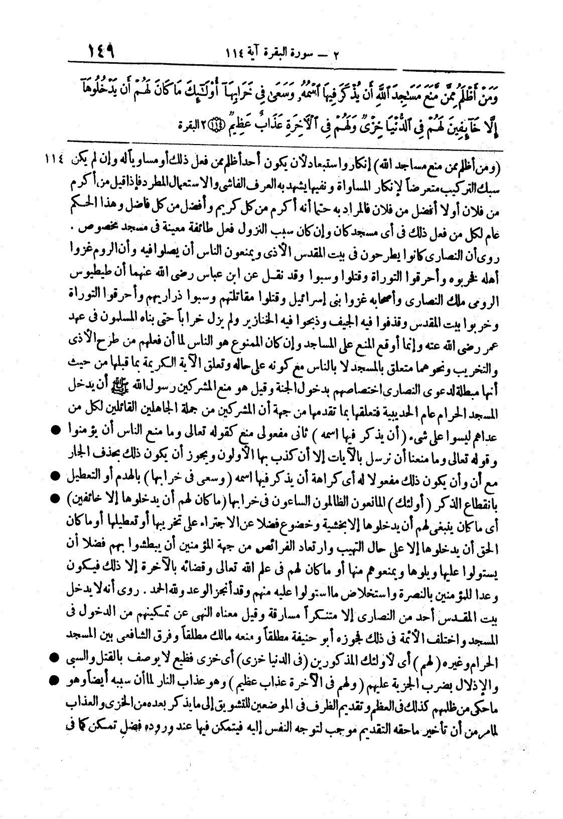 {وَمَنْ أَظْلَمُ مِمَّن مَّنَعَ مساجد الله} إنكارٌ واستبعاد لأن يكون أحدٌ أظلمَ ممن فعل ذلك أومساويا له وإن لم يكن سبكُ التركيب متعرضاً لإنكار المساواة ونفيُها يشهد به العرف الفاشي والاستعمال المطرد فإذا قيل مَنْ أكرمُ من فلان أولا أفضلَ من فلان فالمرادُ به حتماً أنه أكرمُ من كل كريم وأفضل من كل فاضل وهذا الحكم عامٌ لكل من فعل ذلك في أي مسجد كان وإن كان سببَ النزول فعلُ طائفةٍ معينة في مسجد مخصوص رُوي أن النصارى كانوا يطرَحون في بيت المقدس الأذى ويمنعون الناسَ أن يصلوا فيه وأن الرومَ غزَوُا أهلَه فخرَّبوه وأحرقوا التوراة وقتلوا وسبوا وقد نُقلَ عن ابنِ عباسٍ رضيَ الله عنهما أنَّ طِيطَيُوسَ الروميَّ ملكَ النصارى وأصحابَه غزوا بني إسرئيل وقتلوا مُقاتِلَتَهم وسبَوُا ذرارِيَهم وأحرقوا التوراةَ وخرَّبوا بيتَ المقدس وقذفوا فيه الجيفَ وذبحوا فيه الخنازيرَ ولم يزل خراباً حتى بناه المسلمون في عهد عمرَ رضي الله عنه وإنما أُوقعَ المنعُ على المساجد وإن كان الممنوعُ هو الناسَ لما أن فعلَهم من طرح الأذى والتخريب ونحوِهما متعلقٌ بالمسجد لا بالناس مع كونه على حاله وتعلقُ الآيةِ الكريمة بما قبلها من حيث إنها مبطلةٌ لدعوى النصارى اختصاصَهم بدخول الجنة وقيل هو منعُ المشركين من جُملة الجاهلين القائلين لكل مَنْ عداهم ليسوا على شئ