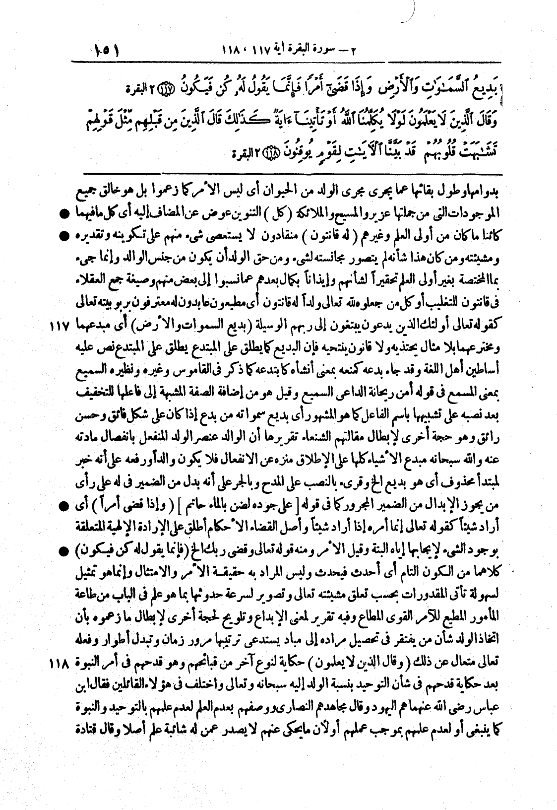 {بديع السماوات والارض} أي مُبدِعُهما ومخترِعُهما بلا مثالٍ يَحتذيه ولا قانونٍ ينتجه فإن البديعَ كما يُطلقُ على المبتدِع يُطلق على المبدع نصَّ عليه أساطينُ أهل اللغة وقد جاء بَدَعَه كمنعه بمعنى أنشأه كابتدعه كما ذُكر في القاموس وغيرِه ونظيرُه السميعُ بمعنى المسمِع في قوله أَمِنْ رَيْحانَةَ الدَّاعي السميعُ وقيل هو من إضافة الصفةِ المشبّهةِ إلى فاعلها للتخفيف بعد نصبه على تشبيهها باسم الفاعِلِ كما هو المشهورُ أي بديعُ سمواتِه من بَدَع إذا كان على شكل فائقٍ وحُسْنٍ رائق وهو حجة أخرى لإبطال مقالتِهم الشنعاءِ تقريرُها أن الوالدَ عنصرُ الولدِ المنفعل بانفصال مادته عنه والله سبحانه مُبدعُ الأشياء كلِّها على الإطلاق منزَّه عن الانفعال فلا يكون والداً ورفعُه على أنه خبرٌ لمبتدأ محذوف أي هو بديعُ الخ وقرئ بالنصبَ على المدح وبالجرِّ على أنه بدلٌ من الضمير في له على رأي من يجوز الإبدالَ من الضمير المجرور كما في قوله ... على جودِه لَضَنَّ بالماء حاتِمُ ...