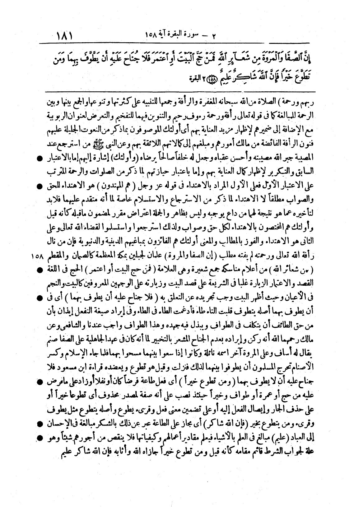 {فلا جناح عليه أن يَطَّوَّفَ بِهِمَا} أي في أن يطوفَ بهما أصلُه يتطوف قلبت التاءُ طاءً فأدغمت الطاءُ في الطاء وفي إيراد صيغةِ التفعُّل إيذانٌ بأن من حق الطائفِ أن يتكلف في الطواف ويبذُل فيه جُهدَه وهذا الطواف واجبٌ عندنا والشافعي وعن مالك رحمهما الله أنه ركنٌ وإيرادُه بعدم الجُناح المشعرِ بالتخيير لما أنه كان في عهد الجاهلية على الصفا صنمٌ يقال له إساف وعلى المروة آخرُ اسمُه نائلة وكانوا إذا سعَوْا بينهما مسَحوا بهما فلما جاء الإسلامُ وكسَّر الأصنامَ تحرَّج المسلمون أن يطوفوا بينهما لذلك فنزلت وقيل هو تطوُّع ويعضُده قراءةُ ابنِ مسعود فلا جُناحَ عليه أن لا يطوفَ بهما