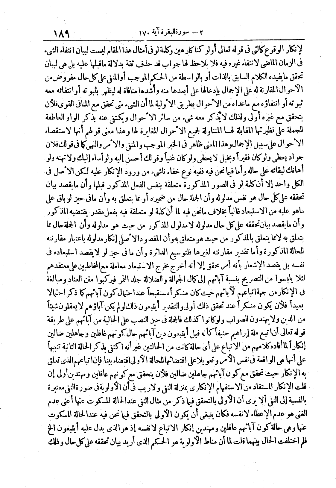 لإنكار الوقوعِ كالتي في قولِه تَعالَى أَوْ لَّوْ كُنَّا كارهين وكلمة لو في أمثالِ هذا المقامِ ليست لبيان انتفاء الشئ في الزمان الماضي لانتفاء غيرِه فيه فلا يلاحظ لها جوابٌ قد حُذف ثقةٍ بدلالةِ ما قبلها عليه بل هي لبيان تحققِ ما يفيده الكلامُ السابقُ بالذَّاتِ أو بالواسطةِ من الحُكم الموجَبِ أو المنفي على كل حالٍ مفروض من الأحوال المقارنةِ له على الإجمال بإدخالِها على أبعدِها منه وأشدِّها منافاةً له ليظهرَ بثبوتهِ أو انتفائِه معه ثبوتُه أو انتفاؤه مع ماعداه من الأحوال بطريق الأولية لما أن الشئ متى تحقَّقَ مع المنافي القويَّ فلأنْ يتحقَّقَ مع غيره أولى ولذلك لا يذكر معه شئ من سائر الأحوال ويكتفى عنه بذكر الواوِ العاطفةِ للجُملة على نظيرتها المقابلةِ لها المتناولة لجميع الأحوالِ المغايرة لها وهذا معنى قولِهم أنها لاستقصاء الأحوالِ على سبيلِ الإجمالِ وهذا المعنى ظاهرٌ في الخبر الموجَبِ والمنفيِّ والأمرِ والنهي كما في قولك فلانٌ جوادٌ يُعطي ولو كان فقيراً وبخيلٌ لا يُعطي ولو كان غنياً وقولِك أحسنْ إليه ولو أساءَ إليك ولا تُهِنْه ولو أهانك لبقائه على حاله وأما فيما نحن فيه نوع خفاء ناشئ من ورود الإنكارِ عليه لكن الأصلَ في الكل واحدٌ إلا أن كلمةَ لو في الصور المذكورةِ متعلقةٌ بنفس الفعل المذكورِ قبلها وأن ما يُقصدُ بيانُ تحققِه على كل حالٍ هو نفسُ مدلولِه وأن الجملةَ حالٌ من ضميره أو مما يتعلق به وأن ما في حيِّز لو باقٍ على ما هو عليه من الاستبعاد غالباً بخلاف ما نحن فيه لما أن كلمةَ لو متعلقةٌ فيه بفعل مقدرٍ يقتضيه المذكورُ وأن ما يُقصد بيانُ تحققِه على كل حال مدلولُه لا مدلولُ المذكورِ من حيث هو مدلولُه وأن الجملةَ حالٌ مما يتعلق به لا مما يتعلق بالمذكور من حيث هو متعلِّقٌ به وأن المقصودَ الأصليَّ إنكارُ مدلولِه باعتبار مقارنتُه للحالة المذكورةِ وأما تقديرُ مقارنته لغيرها فلتوسيع الدائرةِ وأن ما في حيز لولا يُقصد استبعادُه في نفسه بل يقصد الإشعارُ بأنه أَمْرٌ محقَّق إلا أنه أُخرج مُخرَجَ الاستبعادِ معاملةً مع المخاطَبين على معتقدَهم لئلا يلبَسوا من التصريح بنسبة آبائهم إلى كمال الجهالةِ والضلالةِ جلدَ النَّمِرِ فيركبوا متنَ العِناد ومبالغةً في الإنكار من جهة اتباعهم لآبائهم حيث كان منكراً مستقبحاً عند احتمالِ كونِ آبائهم كما ذُكر احتمالاً بعيداً فلأَنْ يكونَ مُنْكراً عند تحققِ ذلك أولى والتقديرُ أيتبعون ذلك لو لم يكن آبَاؤُهم لاَ يَعْقِلُونَ شَيْئًا من الدين ولا يهتدون للصواب ولو كانوا كذلك فالجملةُ في حيز النصبِ على الحالية من آبائهم على طريقة قوله تعالى أَنِ اتبع مِلَّةَ إبراهيم حَنِيفًا كأنه قيل أيتبعون دين آبائهم حالَ كونِهم غافلين وجاهلين ضالّين إنكاراً لما أفاده كلامُهم من الاتّباع على أي حالةٍ كانت من الحالتين غيرَ أنه اكتُفيَ بذكر الحالةِ الثانية تنبيهاً على أنها هي الواقعةُ في نفس الأمر وتعويلاً على اقتضائها للحالة الأولى اقتضاءً بيّناً فإن اتباعهم الذي تعلق به الإنكارُ حيث تحقق مع كونه آبائِهم جاهلين ضالين فلأَنْ يتحقّقَ مع كونهم عاقلين ومُهتدين أوْلى إن قلتَ الإنكارُ المستفادُ من الاستفهام الإنكاريِّ بمنزلة النفي ولا ريب في أن الأولويةَ في صورة النفي معتبرةٌ بالنسبة إلى النفي ألا يُرى أن الأولى بالتحقق فيما ذُكر من مثال النفي عند الحالةِ المسكوتِ عنها أعني عدمَ الغِنى هو عدمُ الإعطاءِ لا نفسُه فكان ينبغي أن يكون الأولى بالتحقق فيما نحن فيه عند الحالةِ المسكوتِ عنها وهي حالة كونِ آبائهم عاقلين ومهتدين إنكار الا تباع لا نفسُه إذ هو الذي يدل عليه أيتبعون االخ فلم اختلفت الحالُ بينهما قلتُ لِما أن مناطَ الأولويةِ هو الحكمُ الذي أريد بيانُ تحققه على كل حال وذلك