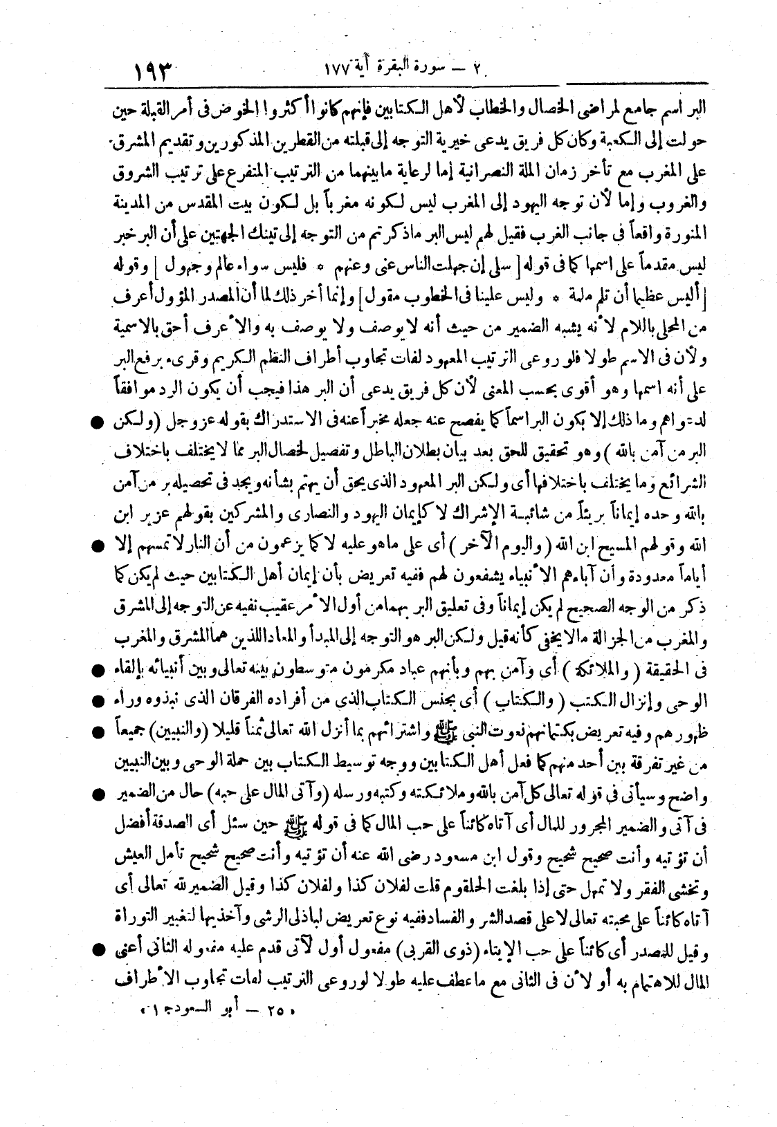 البِرُّ اسمٌ جامع لمراضِي الخصالِ والخطابُ لأهل الكتابين فإنهم كانوا أكثروا الخوضَ في أمر القِبلة حين حُوِّلت إلى الكعبة وكان كلُّ فريقٍ يدّعي خيريةَ التوجُّه إلى قبلته من القُطرين المذكورين وتقديمُ المشرق على المغرب مع تأخر زمانِ الملّةِ النصرانية إما لرعاية ما بينهما من الترتيب المتفرِّع على ترتيب الشروق والغروب وإما لأن توجّه اليهودِ إلى المغرب ليس لكونه مَغرِباً بل لكون بيتِ المقدس من المدينة المنورة واقعاً في جانب الغرب فقيل لهم ليس البر ما ذكرتم من التوجه إلى تينك الجهتين على أن البر خبرُ ليس مقدما على اسمها كما في قوله ... سلي إن جهِلتِ الناس عني وعنهم ... فليس سواءً عالمٌ وجَهولُ ...