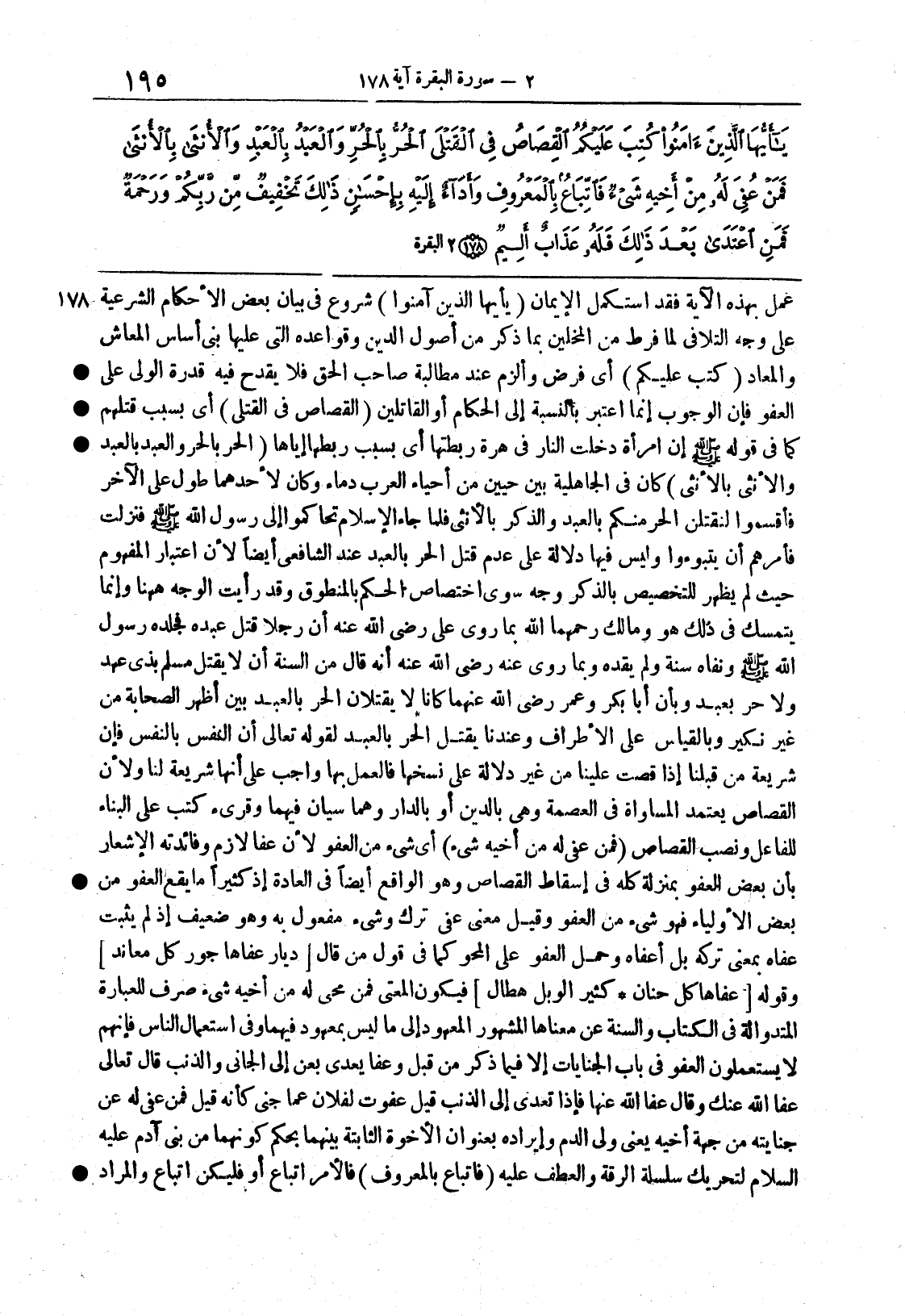 {الحر بِالْحُرّ والعبد بالعبد والانثى بالانثى} كان في الجاهلية بين حيَّيْنِ من أَحياء العربِ دماءٌ وكان لأحدهما طَوْلٌ على الآخر فأقسموا لنقتُلَنَّ الحرَّ منكم بالعبد والذكرَ بالأنثى فلما جاء الإسلامُ تحاكموا إلى رسول الله صلى الله عليه وسلم فنزلت فأمرهم أن يتبوءوا وليس فيها دِلالةٌ على عدم قتل الحرِّ بالعبد عند الشافعي أيضاً لأن اعتبارَ المفهومِ حيث لم يظهر للتخصيص بالذكر وجهٌ سوى اختصاصِ الحُكم بالمنطوقِ وقد رأيتَ الوجهَ ههنا وإنما يتمسك في ذلك هو ومالكٌ رحمهما الله بما روى علي رضي الله عنه أن رجلاً قتل عبدَه فجلده رسول الله صلى الله عليه وسلم ونفاه سنةً ولم يُقِدْه وبما روى عنه رضيَ الله عنه أنَّه قال من السنة أن لايقتل مسلمٌ بذي عهدٍ ولا حرٌّ بعبد وبأن أبا بكر وعمررضي الله عنهما كانا لا يقتلان الحر بالعبد بين أظهر الصحابة من غير نكيرٍ وبالقياس على الأطراف وعندنا يُقتل الحرُّ بالعبد لقوله تعالى أَنَّ النفس بالنفس فإن شريعة مَنْ قبلَنا إذا قُصَّتْ علينا من غير دلالة على نسخها فالعملُ بها واجبٌ على أنها شريعةٌ لنا ولأن القصاصَ يعتمدُ المساواةُ في العصمة وهي بالدين أو بالدار وهما سيان فيهما وقرئ كتب على البناءِ للفاعلِ ونصْبِ القصاص