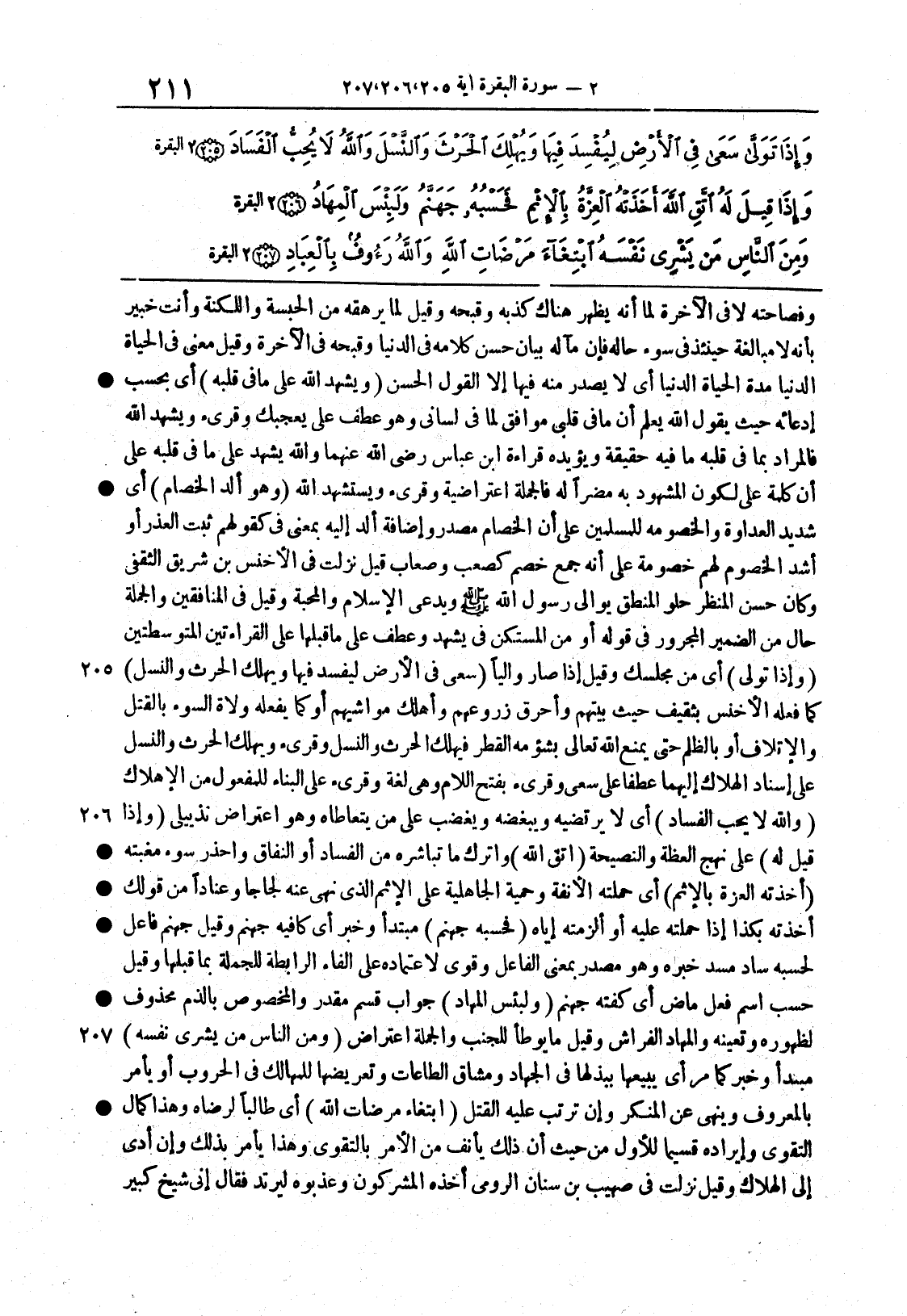 205 - 206 207 البقرة وفصاحته لافي الآخرة لما أنه يظهر هناك كذِبُه وقُبحُه وقيل لما يُرهِقه من الحبْسة واللُكنة وأنت خبيرٌ بأنه لا مبالغة حينئذ في سوء حالِه فإن مآلَه بيانُ حسنِ كلامِه في الدنيا وقبُحِه في الآخرة وقيل معنى في الحياة الدنيا مدة الحياة الدنيا أي لا يصدُر منه فيها إلا القولُ الحسن