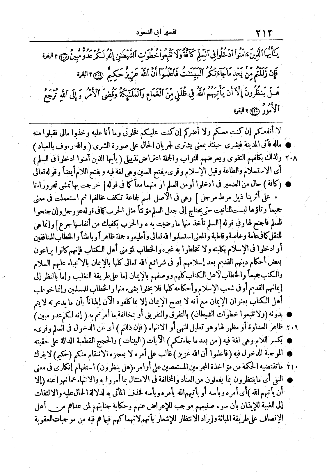 وإنَّما هي للنقل كما في عامة وخاصة وقاطبة والمعنى استسلموا لله تعالى وأطيعوه جملةً ظاهراً وباطناً والخطابُ للمنافقين أو ادخُلوا في الإسلام بكلّيته ولا تخلِطوا به غيَره والخطابُ لمؤمني أهلِ الكتاب فإنهم كانوا يراعون بعضَ أحكام دينهم القديمِ بعد إسلامهم أو شرائع الله تعالى كلِّها بالإيمان بالأنبياء عليهم السلام والكتب جيعا والخطابُ لأهل الكتاب كلِّهم ووصفُهم بالإيمان إما على طريقة التغليب وإما بالنظر إلى إيمانهم القديم أو في شعب الإسلام وأحكامِه كلها فلا يخلوا بشئ منها والخطاب للمسلمين وإنما خوطب أهلُ الكتاب بعنوان الإيمان مع أنه لا يصِح الإيمانُ إلا بما كلَّفوه الآن إيذاناً بأن ما يدّعونه لا يتمّ بدونه