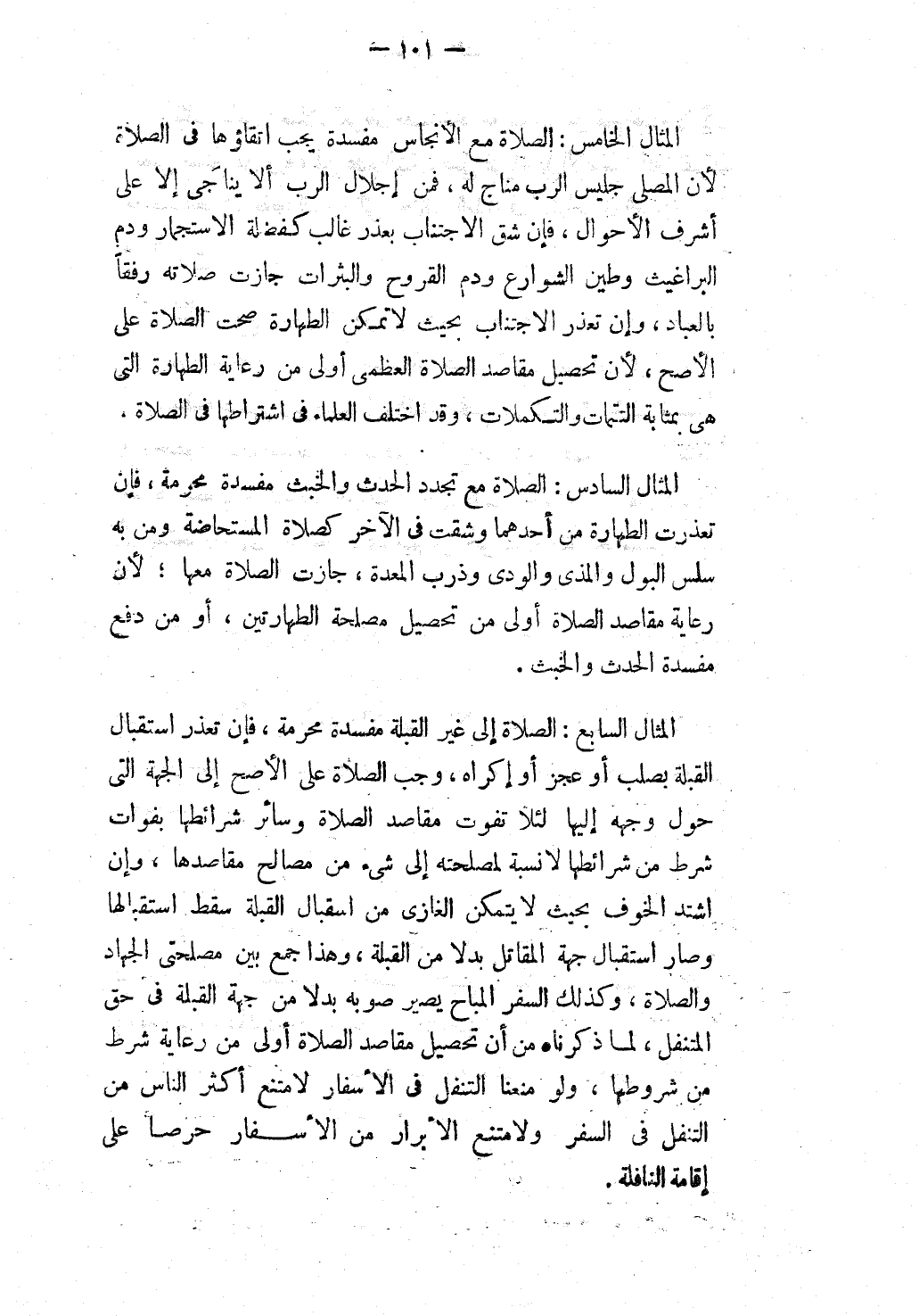 الْمِثَالُ الْخَامِسُ: الصَّلَاةُ مَعَ الْأَنْجَاسِ مَفْسَدَةٌ يَجِبُ اتِّقَاؤُهَا فِي الصَّلَاةِ لِأَنَّ الْمُصَلِّيَ جَلِيسُ الرَّبِّ مُنَاجٍ لَهُ، فَمِنْ إجْلَالِ الرَّبِّ أَلَّا يُنَاجَى إلَّا عَلَى أَشْرَفِ الْأَحْوَالِ، فَإِنْ شَقَّ الِاجْتِنَابُ بِعُذَرٍ غَالِبٍ كَفَضْلَةِ الِاسْتِجْمَارِ وَدَمِ الْبَرَاغِيثِ وَطِينِ الشَّوَارِعِ وَدَمِ الْقُرُوحِ وَالْبَثَرَاتِ جَازَتْ صَلَاتُهُ رِفْقًا بِالْعِبَادِ، وَإِنْ تَعَذَّرَ الِاجْتِنَابُ بِحَيْثُ لَا تُمْكِنُ الطَّهَارَةُ صَحَّتْ الصَّلَاةُ عَلَى الْأَصَحِّ، لِأَنَّ تَحْصِيلَ مَقَاصِدِ الصَّلَاةِ الْعُظْمَى أَوْلَى مِنْ رِعَايَةِ الطَّهَارَةِ الَّتِي هِيَ بِمَثَابَةِ التَّتِمَّاتِ وَالتَّكْمِلَاتِ، وَقَدْ اخْتَلَفَ الْعُلَمَاءُ فِي اشْتِرَاطِهَا فِي الصَّلَاةِ.