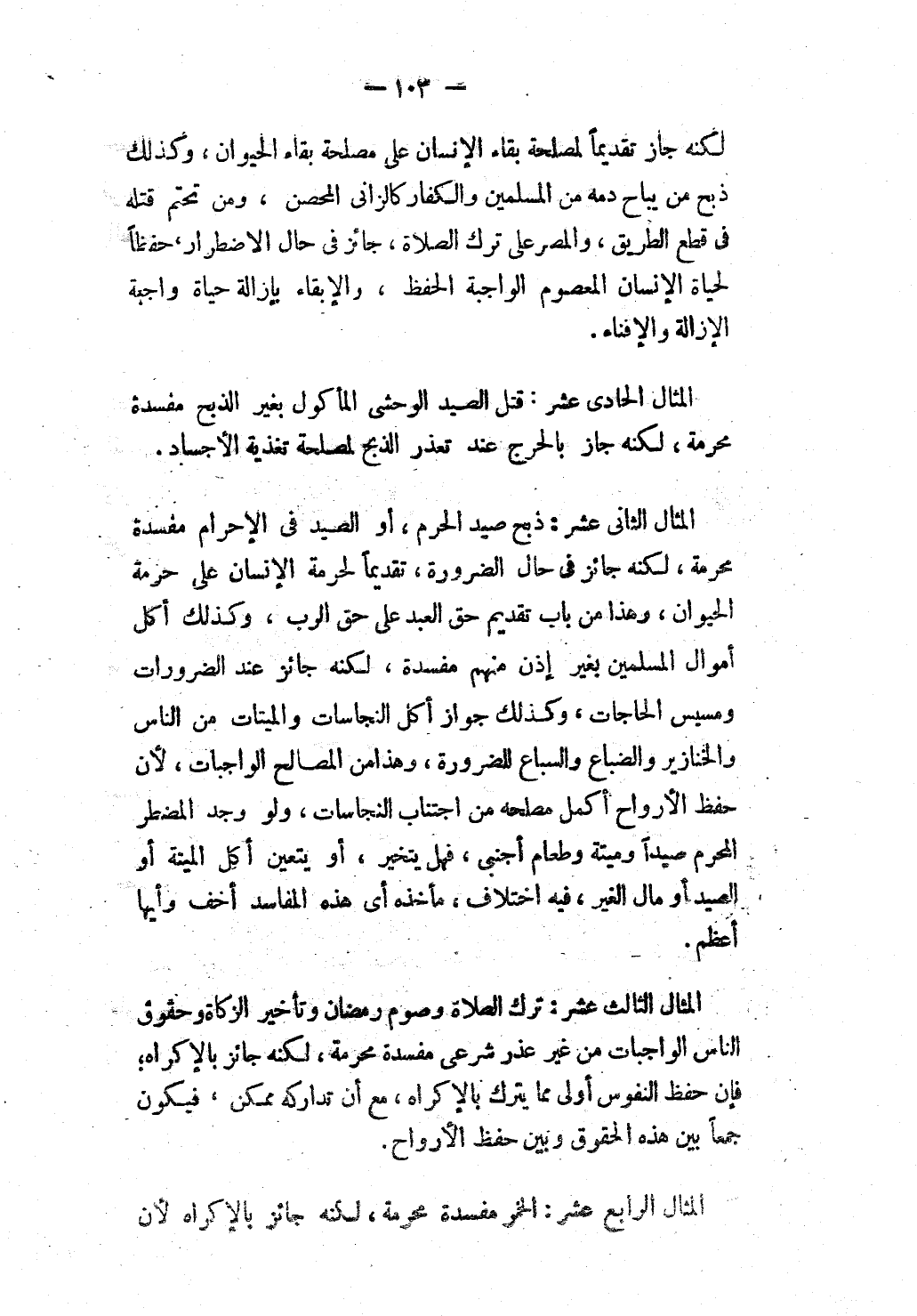 الْمِثَالُ الْحَادِيَ عَشَرَ: قَتْلُ الصَّيْدِ الْوَحْشِيِّ الْمَأْكُولِ بِغَيْرِ الذَّبْحِ مَفْسَدَةٌ مُحَرَّمَةٌ، لَكِنَّهُ جَازَ بِالْحَرَجِ عِنْدَ تَعَذُّرِ الذَّبْحِ لِمَصْلَحَةِ تَغْذِيَةِ الْأَجْسَادِ.