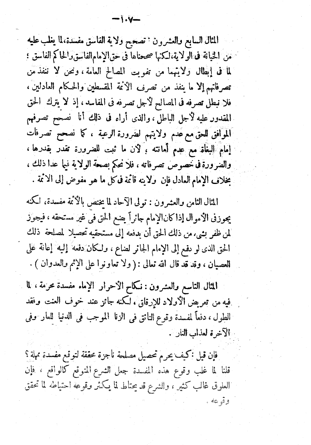 الْمِثَالُ السَّابِعُ وَالْعِشْرُونَ: تَصْحِيحُ وِلَايَةِ الْفَاسِقِ مَفْسَدَةٌ، لِمَا يَغْلِبُ عَلَيْهِ مِنْ الْخِيَانَةِ فِي الْوِلَايَةِ، لَكِنَّهَا صَحَّحْنَاهَا فِي حَقِّ الْإِمَامِ الْفَاسِقِ وَالْحَاكِمِ الْفَاسِقِ؛ لِمَا فِي إبْطَالِ وِلَايَتِهِمَا مِنْ تَفْوِيتِ الْمَصَالِحِ الْعَامَّةِ، وَنَحْنُ لَا نُنَفِّذُ مِنْ تَصَرُّفَاتِهِمْ إلَّا مَا يُنَفَّذُ مِنْ تَصَرُّفِ الْأَئِمَّةِ الْمُقْسِطِينَ وَالْحُكَّامِ الْعَادِلِينَ، فَلَا نُبْطِلُ تَصَرُّفَهُ فِي الْمَصَالِحِ لِأَجْلِ تَصَرُّفِهِ فِي الْمَفَاسِدِ، إذْ لَا يُتْرَكُ الْحَقُّ الْمَقْدُورُ عَلَيْهِ لِأَجْلِ الْبَاطِلِ، وَاَلَّذِي أَرَاهُ فِي ذَلِكَ أَنَّا نُصَحِّحُ تَصَرُّفَهُمْ الْمُوَافِقَ لِلْحَقِّ مَعَ عَدَمِ وِلَايَتِهِمْ لِضَرُورَةِ الرَّعِيَّةِ، كَمَا نُصَحِّحُ تَصَرُّفَاتِ إمَامِ الْبُغَاةِ مَعَ عَدَمِ أَمَانَتِهِ؛ لِأَنَّ مَا ثَبَتَ لِلضَّرُورَةِ تُقَدَّرُ بِقَدْرِهَا، وَالضَّرُورَةُ فِي خُصُوصِ تَصَرُّفَاتِهِ، فَلَا نَحْكُمُ بِصِحَّةِ الْوِلَايَةِ فِيمَا عَدَا ذَلِكَ، بِخِلَافِ الْإِمَامِ الْعَادِلِ فَإِنَّ وِلَايَتَهُ قَائِمَةٌ فِي كُلِّ مَا هُوَ مُفَوَّضٌ إلَى الْأَئِمَّةِ.