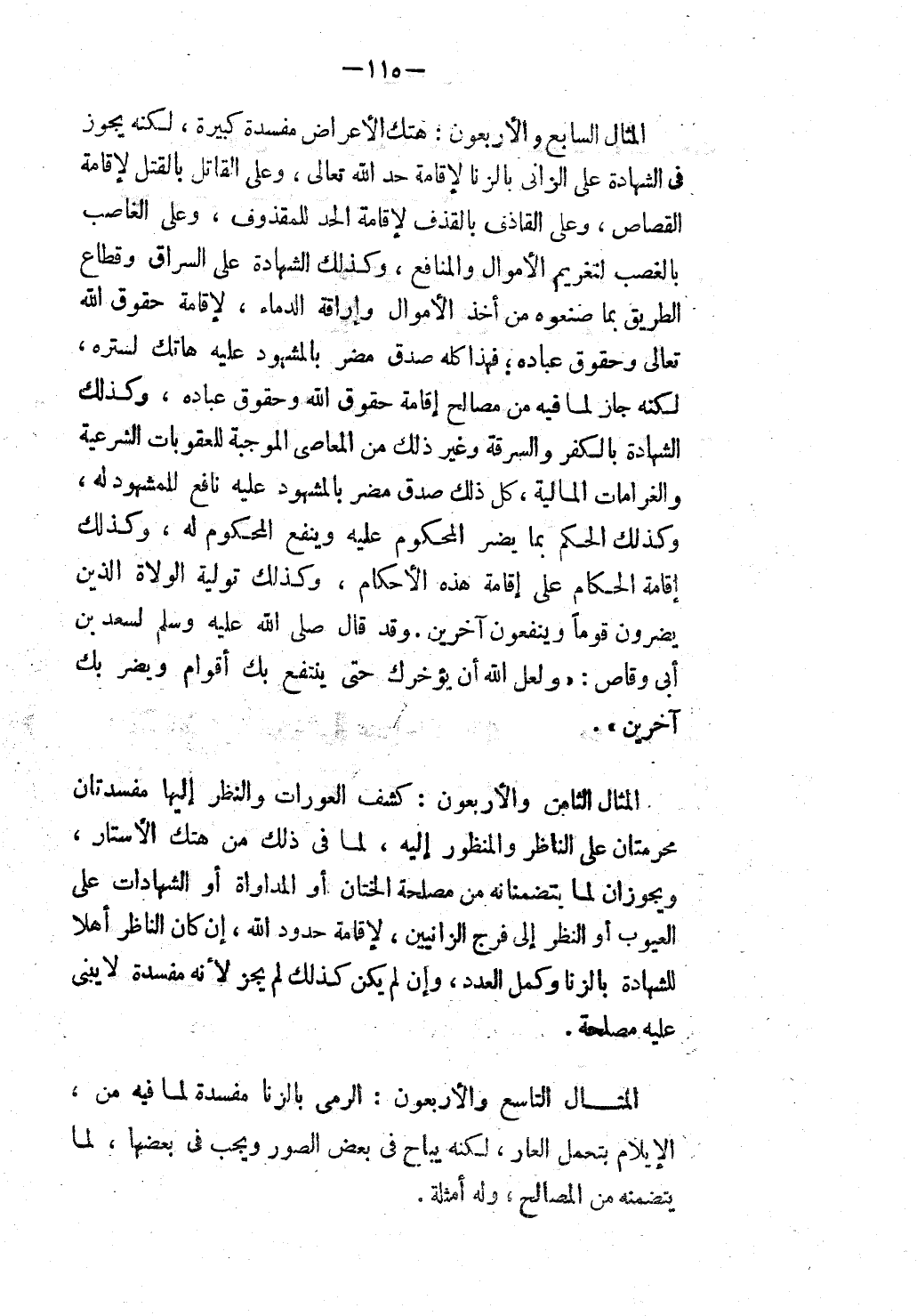 الْمِثَالُ السَّابِعُ وَالْأَرْبَعُونَ: هَتْكُ الْأَعْرَاضِ مَفْسَدَةٌ كَبِيرَةٌ، لَكِنَّهُ يَجُوزُ فِي الشَّهَادَةِ عَلَى الزَّانِي بِالزِّنَا لِإِقَامَةِ حَدِّ اللَّهِ تَعَالَى، وَعَلَى الْقَاتِلِ بِالْقَتْلِ لِإِقَامَةِ الْقِصَاصِ، وَعَلَى الْقَاذِفِ بِالْقَذْفِ لِإِقَامَةِ الْحَدِّ لِلْمَقْذُوفِ، وَعَلَى الْغَاصِبِ بِالْغَصْبِ لِتَغْرِيمِ الْأَمْوَالِ وَالْمَنَافِعِ.