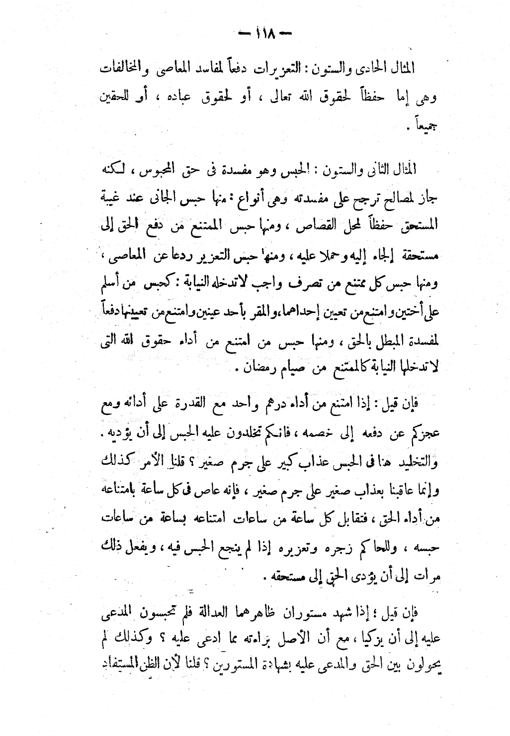 الْمِثَالُ الثَّانِي وَالسِّتُّونَ: الْحَبْسُ وَهُوَ مَفْسَدَةٌ فِي حَقِّ الْمَحْبُوسِ، لَكِنَّهُ جَازَ لِمَصَالِحَ تُرَجَّحُ عَلَى مَفْسَدَتِهِ وَهِيَ أَنْوَاعٌ: مِنْهَا حَبْسُ الْجَانِي عِنْدَ غَيْبَةِ الْمُسْتَحِقِّ حِفْظًا لِمَحَلِّ الْقِصَاصِ، وَمِنْهَا حَبْسُ الْمُمْتَنِعِ مِنْ دَفْعِ الْحَقِّ إلَى مُسْتَحِقِّهِ إلْجَاءً إلَيْهِ وَحَمْلًا عَلَيْهِ، وَمِنْهَا حَبْسُ التَّعْزِيرِ رَدْعًا عَنْ الْمَعَاصِي، وَمِنْهَا حَبْسُ كُلِّ مُمْتَنِعٍ مِنْ تَصَرُّفٍ وَاجِبٍ لَا تَدْخُلُهُ النِّيَابَةُ: كَحَبْسِ مَنْ أَسْلَمَ عَلَى أُخْتَيْنِ وَامْتَنَعَ مِنْ تَعْيِينِ إحْدَاهُمَا، وَالْمُقِرُّ بِأَحَدِ عَيْنَيْنِ وَامْتَنَعَ مِنْ تَعْيِينِهَا دَفْعًا لِمَفْسَدَةِ الْمُبْطِلِ بِالْحَقِّ، وَمِنْهَا حَبْسُ مَنْ امْتَنَعَ مِنْ أَدَاءِ حُقُوقِ اللَّهِ الَّتِي لَا تَدْخُلُهَا النِّيَابَةُ كَالْمُمْتَنِعِ مِنْ صِيَامِ رَمَضَانَ فَإِنْ قِيلَ: إذَا امْتَنَعَ مِنْ أَدَاءِ دِرْهَمٍ وَاحِدٍ مَعَ الْقُدْرَةِ عَلَى أَدَائِهِ وَمَعَ عَجْزِكُمْ عَنْ دَفْعِهِ إلَى خَصْمِهِ، فَإِنَّكُمْ تُخَلِّدُونَ عَلَيْهِ الْحَبْسَ إلَى أَنْ يُؤَدِّيَهُ. وَالتَّخْلِيدُ هُنَا فِي الْحَبْسِ عَذَابٌ كَبِيرٌ عَلَى جُرْمٍ صَغِيرٍ؟ قُلْنَا الْأَمْرُ كَذَلِكَ وَإِنَّمَا عَاقَبْنَا بِعَذَابٍ صَغِيرٍ عَلَى جُرْمٍ صَغِيرٍ، فَإِنَّهُ عَاصٍ فِي كُلِّ سَاعَةٍ بِامْتِنَاعِهِ مِنْ أَدَاءِ الْحَقِّ، فَتُقَابَلُ كُلُّ سَاعَةٍ مِنْ سَاعَاتِ امْتِنَاعِهِ بِسَاعَةٍ مِنْ سَاعَاتِ حَبْسِهِ، وَلِلْحَاكِمِ زَجْرُهُ وَتَعْزِيرُهُ إذَا لَمْ يَنْجَعْ الْحَبْسُ فِيهِ، وَيَفْعَلُ ذَلِكَ مَرَّاتٍ إلَى أَنْ يُؤَدِّيَ الْحَقَّ إلَى مُسْتَحِقِّهِ.