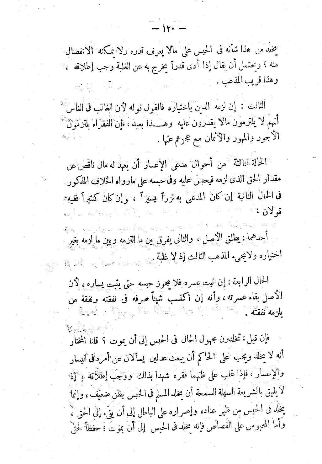 الثَّالِثُ: إنْ لَزِمَهُ الدَّيْنُ بِاخْتِيَارِهِ فَالْقَوْلُ قَوْلُهُ لِأَنَّ الْغَالِبَ فِي النَّاسِ أَنَّهُمْ لَا يَلْتَزِمُونَ مَا لَا يَقْدِرُونَ عَلَيْهِ وَهَذَا بَعِيدٌ، فَإِنَّ الْفُقَرَاءَ يَلْتَزِمُونَ الْأُجُورَ وَالْمُهُورَ وَالْأَثْمَانَ مَعَ عَجْزِهِمْ عَنْهَا. الْحَالَةُ الثَّالِثَةُ مِنْ أَحْوَالِ مُدَّعِي الْإِعْسَارَ أَنْ يُعْهَدَ لَهُ مَالٌ نَاقِصٌ عَنْ مِقْدَارِ الْحَقِّ الَّذِي لَزِمَهُ فَيُحْبَسُ عَلَيْهِ وَفِي حَبْسِهِ عَلَى مَا رَوَاهُ الْخِلَافُ الْمَذْكُورُ فِي الْحَالِ الثَّانِيَةِ إنْ كَانَ الْمُدَّعِي بِهِ نَزْرًا يَسِيرًا، وَإِنْ كَانَ كَثِيرًا فَفِيهِ قَوْلَانِ: