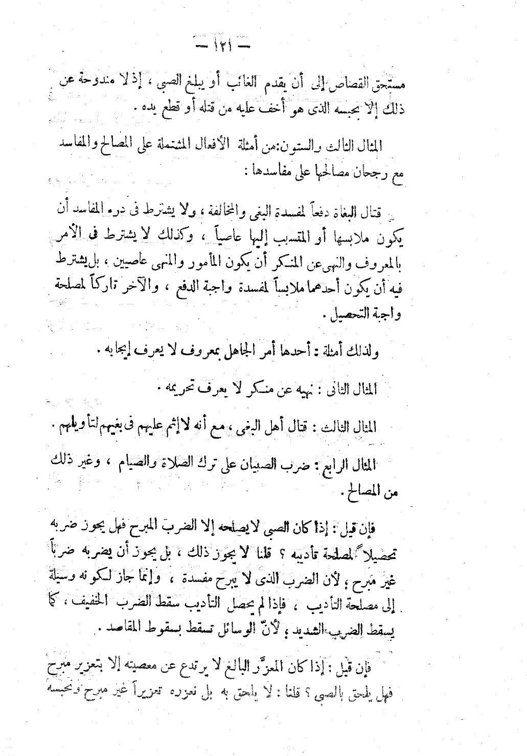 الْمِثَالُ الرَّابِعُ: ضَرْبُ الصِّبْيَانِ عَلَى تَرْكِ الصَّلَاةِ وَالصِّيَامِ، وَغَيْرِ ذَلِكَ مِنْ الْمَصَالِحِ. فَإِنْ قِيلَ: إذَا كَانَ الصَّبِيُّ لَا يُصْلِحُهُ إلَّا الضَّرْبُ الْمُبَرِّحُ فَهَلْ يَجُوزُ ضَرْبُهُ تَحْصِيلًا لِمَصْلَحَةِ تَأْدِيبِهِ؟ قُلْنَا لَا يَجُوزُ ذَلِكَ، بَلْ يَجُوزُ أَنْ يَضْرِبَهُ ضَرْبًا غَيْرَ مُبَرِّحٍ؛ لِأَنَّ الضَّرْبَ الَّذِي لَا يُبَرِّحُ مَفْسَدَةٌ، وَإِنَّمَا جَازَ لِكَوْنِهِ وَسِيلَةً إلَى مَصْلَحَةِ التَّأْدِيبِ، فَإِذَا لَمْ يَحْصُلْ التَّأْدِيبُ سَقَطَ الضَّرْبُ الْخَفِيفُ، كَمَا يَسْقُطُ الضَّرْبُ الشَّدِيدُ؛ لِأَنَّ الْوَسَائِلَ تَسْقُطُ بِسُقُوطِ الْمَقَاصِدِ. فَإِنْ قِيلَ: إذَا كَانَ الْمُعَزَّرُ الْبَالِغُ لَا يَرْتَدِعُ عَنْ مَعْصِيَتِهِ إلَّا بِتَعْزِيرٍ مُبَرِّحٍ فَهَلْ يَلْحَقُ بِالصَّبِيِّ؟ قُلْنَا: لَا يَلْحَقُ بِهِ بَلْ نُعَزِّرُهُ تَعْزِيرًا غَيْرَ مُبَرِّحٍ وَنَحْبِسُهُ