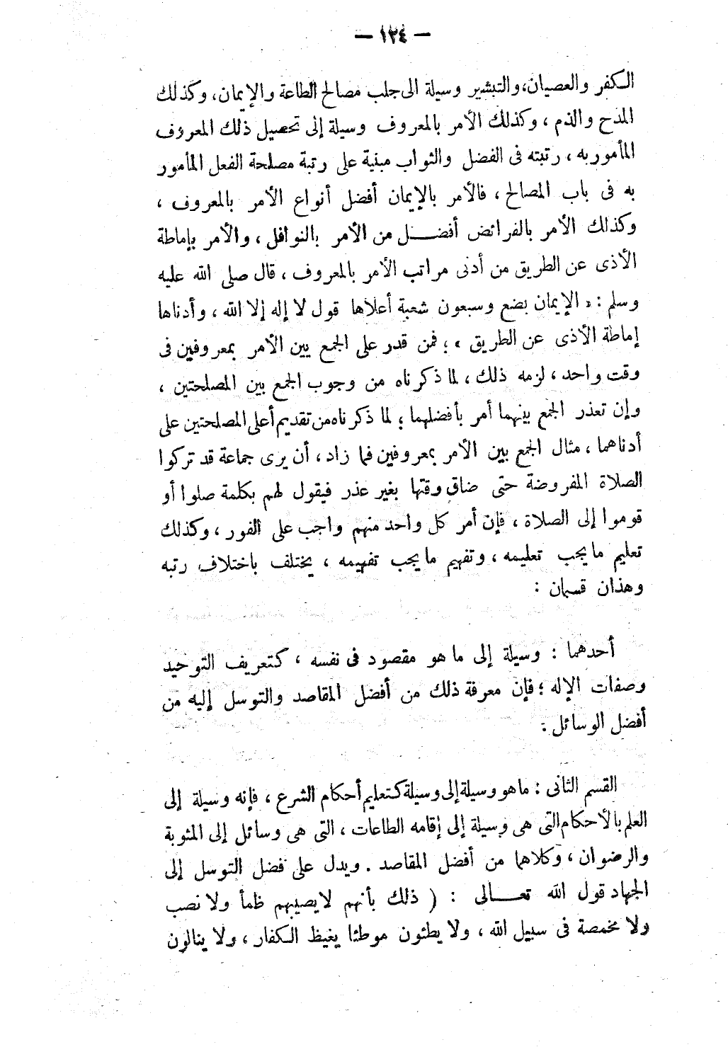 وَكَذَلِكَ تَعْلِيمُ مَا يَجِبُ تَعْلِيمُهُ، وَتَفْهِيمُ مَا يَجِبُ تَفْهِيمُهُ، يَخْتَلِفُ بِاخْتِلَافِ رُتَبِهِ وَهَذَانِ قِسْمَانِ: أَحَدُهُمَا: وَسِيلَةٌ إلَى مَا هُوَ مَقْصُودٌ فِي نَفْسِهِ، كَتَعْرِيفِ التَّوْحِيدِ وَصِفَاتِ الْإِلَهِ؛ فَإِنَّ مَعْرِفَةَ ذَلِكَ مِنْ أَفْضَلِ الْمَقَاصِدِ وَالتَّوَسُّلُ إلَيْهِ مِنْ أَفْضَلِ الْوَسَائِلِ.