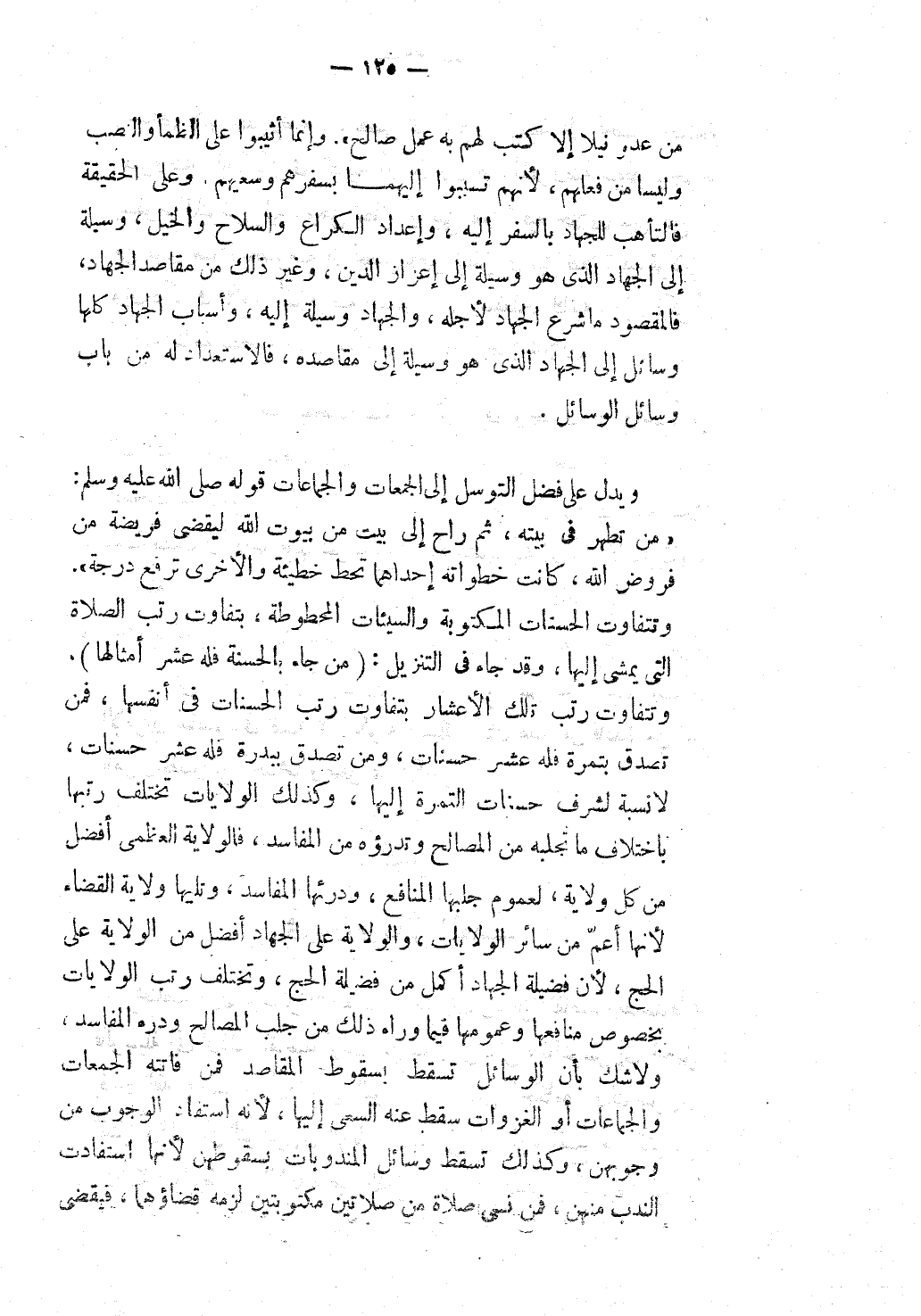 وَإِنَّمَا أُثِيبُوا عَلَى الظَّمَأِ وَالنَّصَبِ وَلَيْسَا مِنْ فِعْلِهِمْ، لِأَنَّهُمْ تَسَبَّبُوا إلَيْهِمَا بِسَفَرِهِمْ وَسَعْيِهِمْ. وَعَلَى الْحَقِيقَةِ فَالتَّأَهُّبُ لِلْجِهَادِ بِالسَّفَرِ إلَيْهِ، وَإِعْدَادِ الْكُرَاعِ وَالسِّلَاحِ وَالْخَيْلِ، وَسِيلَةٌ إلَى الْجِهَادِ الَّذِي هُوَ وَسِيلَةٌ إلَى إعْزَازِ الدِّينِ، وَغَيْرِ ذَلِكَ مِنْ مَقَاصِدِ الْجِهَادِ، فَالْمَقْصُودُ مَا شُرِعَ الْجِهَادُ لِأَجْلِهِ، وَالْجِهَادُ وَسِيلَةٌ إلَيْهِ، وَأَسْبَابُ الْجِهَادِ كُلُّهَا وَسَائِلُ إلَى الْجِهَادِ الَّذِي هُوَ وَسِيلَةٌ إلَى مَقَاصِدِهِ، فَالِاسْتِعْدَادُ لَهُ مِنْ بَابِ وَسَائِلِ الْوَسَائِلِ. وَيَدُلُّ عَلَى فَضْلِ التَّوَسُّلِ إلَى الْجُمُعَاتِ وَالْجَمَاعَاتِ قَوْلُهُ - صَلَّى اللَّهُ عَلَيْهِ وَسَلَّمَ -: «مَنْ تَطَهَّرَ فِي بَيْتِهِ، ثُمَّ رَاحَ إلَى بَيْتٍ مِنْ بُيُوتِ اللَّهِ لِيَقْضِيَ فَرِيضَةً مِنْ فُرُوضِ اللَّهِ، كَانَتْ خُطُوَاتُهُ إحْدَاهُمَا تَحُطُّ خَطِيئَةً وَالْأُخْرَى تَرْفَعُ دَرَجَةً» .