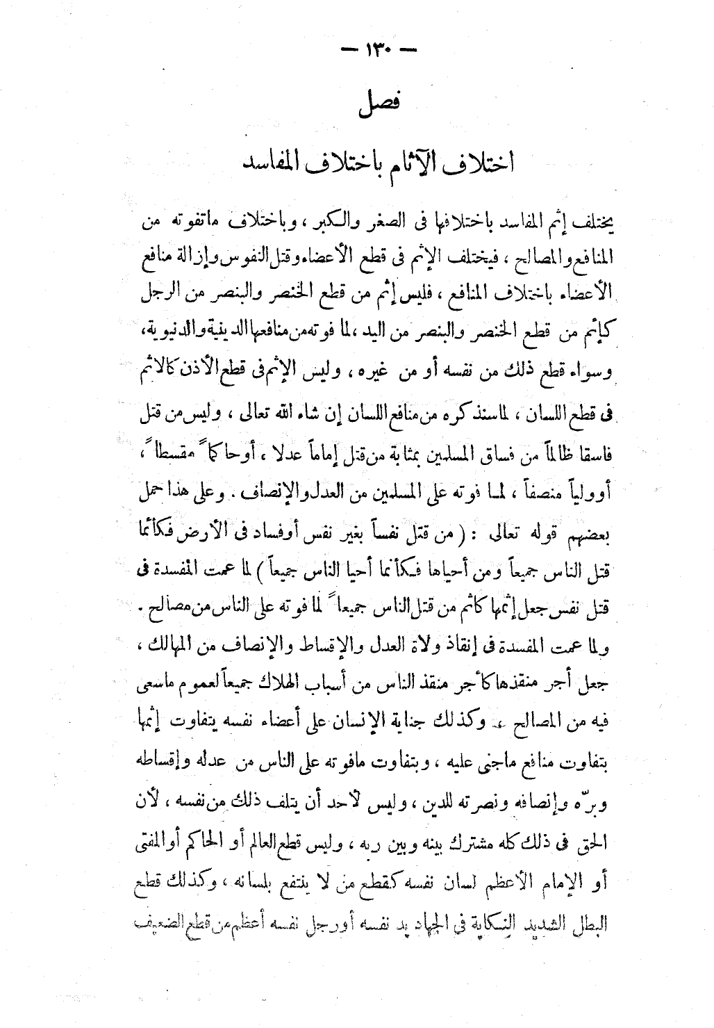 يَخْتَلِفُ إثْمُ الْمَفَاسِدِ بِاخْتِلَافِهَا فِي الصِّغَرِ وَالْكِبَرِ، وَبِاخْتِلَافِ مَا تُفَوِّتُهُ مِنْ الْمَنَافِعِ وَالْمَصَالِحِ، فَيَخْتَلِفُ الْإِثْمُ فِي قَطْعِ الْأَعْضَاءِ وَقَتْلِ النُّفُوسِ وَإِزَالَةِ مَنَافِعِ الْأَعْضَاءِ بِاخْتِلَافِ الْمَنَافِعِ، فَلَيْسَ إثْمُ مَنْ قَطَعَ الْخِنْصَرَ وَالْبِنْصِرُ مِنْ الرِّجْلِ كَإِثْمِ مَنْ قَطَعَ الْخِنْصَرَ وَالْبِنْصِرَ مِنْ الْيَدِ، لِمَا فَوَّتَهُ مِنْ مَنَافِعِهَا الدِّينِيَّةِ وَالدُّنْيَوِيَّةِ، وَسَوَاءٌ قَطَعَ ذَلِكَ مِنْ نَفْسِهِ أَوْ مِنْ غَيْرِهِ، وَلَيْسَ الْإِثْمُ فِي قَطْعِ الْأُذُنِ كَالْإِثْمِ فِي قَطْعِ اللِّسَانِ، لِمَا سَنَذْكُرُهُ مِنْ مَنَافِعِ اللِّسَانِ إنْ شَاءَ اللَّهُ تَعَالَى، وَلَيْسَ مَنْ قَتَلَ فَاسِقًا ظَالِمًا مِنْ فُسَّاقِ الْمُسْلِمِينَ بِمَثَابَةِ مَنْ قَتَلَ إمَامًا عَدْلًا، أَوْ حَاكِمًا مُقْسِطًا، أَوْ وَلِيًّا مُنْصِفًا، لِمَا فَوَّتَهُ عَلَى الْمُسْلِمِينَ مِنْ الْعَدْلِ وَالْإِنْصَافِ. وَعَلَى هَذَا حَمَلَ بَعْضُهُمْ قَوْله تَعَالَى: {مَنْ قَتَلَ نَفْسًا بِغَيْرِ نَفْسٍ أَوْ فَسَادٍ فِي الأَرْضِ فَكَأَنَّمَا قَتَلَ النَّاسَ جَمِيعًا وَمَنْ أَحْيَاهَا فَكَأَنَّمَا أَحْيَا النَّاسَ جَمِيعًا} [المائدة: 32] لَمَّا عَمَّتْ الْمَفْسَدَةُ فِي قَتْلِ نَفْسٍ جَعَلَ إثْمَهَا كَإِثْمِ مَنْ قَتَلَ النَّاسَ جَمِيعًا لِمَا فَوَّتَهُ عَلَى النَّاسِ مِنْ مَصَالِحَ وَلَمَّا عَمَّتْ الْمَفْسَدَةُ فِي إنْقَاذِ وُلَاةِ الْعَدْلِ وَالْإِقْسَاطِ وَالْإِنْصَافِ مِنْ الْمَهَالِكِ، جَعَلَ أَجْرَ مُنْقِذِهَا كَأَجْرِ مُنْقِذِ النَّاسِ مِنْ أَسْبَابِ الْهَلَاكِ جَمِيعًا لِعُمُومِ مَا سَعَى فِيهِ مِنْ الْمَصَالِحِ، وَكَذَلِكَ جِنَايَةُ الْإِنْسَانِ عَلَى أَعْضَاءِ نَفْسِهِ يَتَفَاوَتُ إثْمُهَا بِتَفَاوُتِ مَنَافِعِ مَا جَنَى عَلَيْهِ، وَبِتَفَاوُتِ مَا فَوَّتَهُ عَلَى النَّاسِ مِنْ عَدْلِهِ وَإِقْسَاطِهِ وَبِرِّهِ وَإِنْصَافِهِ وَنُصْرَتِهِ لِلدِّينِ، وَلَيْسَ لِأَحَدٍ أَنْ يُتْلِفَ ذَلِكَ مِنْ نَفْسِهِ، لِأَنَّ الْحَقَّ فِي ذَلِكَ كُلِّهِ مُشْتَرَكٌ بَيْنَهُ وَبَيْنَ رَبِّهِ، وَلَيْسَ قَطْعُ الْعَالِمِ أَوْ الْحَاكِمِ أَوْ الْمُفْتِي أَوْ الْإِمَامِ الْأَعْظَمِ لِسَانَ نَفْسِهِ كَقَطْعِ مَنْ لَا يَنْتَفِعُ بِلِسَانِهِ.