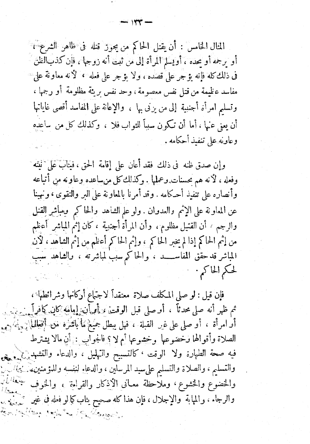 الْمِثَالُ الْخَامِسُ أَنْ يَقْتُلَ الْحَاكِمُ مَنْ يَجُوزُ قَتْلُهُ فِي ظَاهِرِ الشَّرْعِ، أَوْ يَرْجُمَهُ أَوْ يَحُدَّهُ، أَوْ يُسَلِّمَ الْمَرْأَةَ إلَى مَنْ ثَبَتَ أَنَّهُ زَوْجُهَا، فَإِنْ كَذَبَ الظَّنُّ فِي ذَلِكَ كُلِّهِ فَإِنَّهُ يُؤْجَرُ عَلَى قَصْدِهِ، وَلَا يُؤْجَرُ عَلَى فِعْلِهِ، لِأَنَّهُ مُعَاوَنَةٌ عَلَى مَفَاسِدَ عَظِيمَةٍ مِنْ قَتْلِ نَفْسٍ مَعْصُومَةٍ، وَحَدِّ نَفْسٍ بَرِيئَةٍ مَظْلُومَةٍ أَوْ رَجْمِهَا، وَتَسْلِيمِ امْرَأَةٍ أَجْنَبِيَّةٍ إلَى مَنْ يَزْنِي بِهَا، وَالْإِعَانَةِ عَلَى الْمَفَاسِدِ أَقْصَى غَايَاتِهَا أَنْ يُعْفَى عَنْهَا، أَمَّا أَنْ تَكُونَ سَبَبًا لِلثَّوَابِ فَلَا.