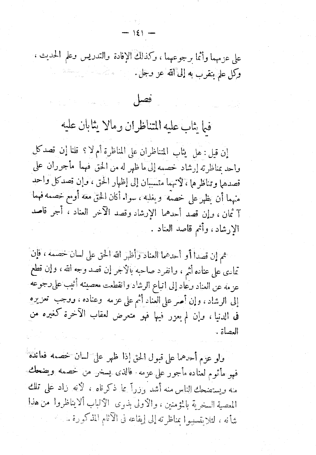 إنْ قِيلَ: هَلْ يُثَابُ الْمُتَنَاظِرَانِ عَلَى الْمُنَاظَرَةِ أَمْ لَا؟ قُلْنَا إنْ قَصَدَ كُلُّ وَاحِدٍ بِمُنَاظَرَتِهِ إرْشَادَ خَصْمِهِ إلَى مَا ظَهَرَ لَهُ مِنْ الْحَقِّ فَهُمَا مَأْجُورَانِ عَلَى قَصْدِهِمَا وَتَنَاظُرِهِمَا، لِأَنَّهُمَا مُتَسَبِّبَانِ إلَى إظْهَارِ الْحَقِّ، وَإِنْ قَصَدَ كُلُّ وَاحِدٍ مِنْهُمَا أَنْ يَظْهَرَ عَلَى خَصْمِهِ وَيَغْلِبَهُ، سَوَاءٌ أَكَانَ الْحَقُّ مَعَهُ أَوْ مَعَ خَصْمِهِ فَهُمَا آثِمَانِ، وَإِنْ قَصَدَ أَحَدُهُمَا الْإِرْشَادَ وَقَصَدَ الْآخَرُ الْعِنَادَ، أُجِرَ قَاصِدُ الْإِرْشَادِ، وَأَثِمَ قَاصِدُ الْعِنَادِ. ثُمَّ إنْ قَصَدَا أَوْ أَحَدُهُمَا الْعِنَادَ وَأَظْهَرَ اللَّهُ الْحَقَّ عَلَى لِسَانِ خَصْمِهِ، فَإِنْ تَمَادَى عَلَى عِنَادِهِ أَثِمَ، وَانْفَرَدَ صَاحِبُهُ بِالْأَجْرِ إنْ قَصَدَ وَجْهَ اللَّهِ، وَإِنْ قَطَعَ عَزْمَهُ عَنْ الْعِنَادِ وَعَادَ إلَى اتِّبَاعِ الرَّشَادِ وَانْقَطَعَتْ مَعْصِيَتُهُ أُثِيبَ عَلَى رُجُوعِهِ إلَى الرَّشَادِ، وَإِنْ أَصَرَّ عَلَى الْعِنَادِ أَثِمَ عَلَى عَزْمِهِ وَعِنَادِهِ، وَوَجَبَ تَعْزِيرُهُ فِي الدُّنْيَا، وَإِنْ لَمْ يُعَزَّرْ فِيهَا فَهُوَ مُتَعَرِّضٌ لِعِقَابِ الْآخِرَةِ كَغَيْرِهِ مِنْ الْعُصَاةِ. وَلَوْ عَزَمَ أَحَدُهُمَا عَلَى قَبُولِ الْحَقِّ إذَا ظَهَرَ عَلَى لِسَانِ خَصْمِهِ فَعَانَدَهُ فَهُوَ مَأْثُومٌ لِعِنَادِهِ مَأْجُورٌ عَلَى عَزْمِهِ فَاَلَّذِي يَسْخَرُ مِنْ خَصْمِهِ وَيَضْحَكُ مِنْهُ وَيَسْتَضْحِكُ النَّاسَ مِنْهُ أَشَدُّ وِزْرًا مِمَّا ذَكَرْنَاهُ، لِأَنَّهُ زَادَ عَلَى تِلْكَ الْمَعْصِيَةِ السُّخْرِيَةَ بِالْمُؤْمِنِينَ، وَالْأَوْلَى بِذَوِي الْأَلْبَابِ أَلَّا يُنَاظِرُوا مَنْ هَذَا شَأْنُهُ، لِئَلَّا يَتَسَبَّبُوا بِمُنَاظَرَتِهِ إلَى إيقَاعِهِ فِي الْآثَامِ الْمَذْكُورَةِ.